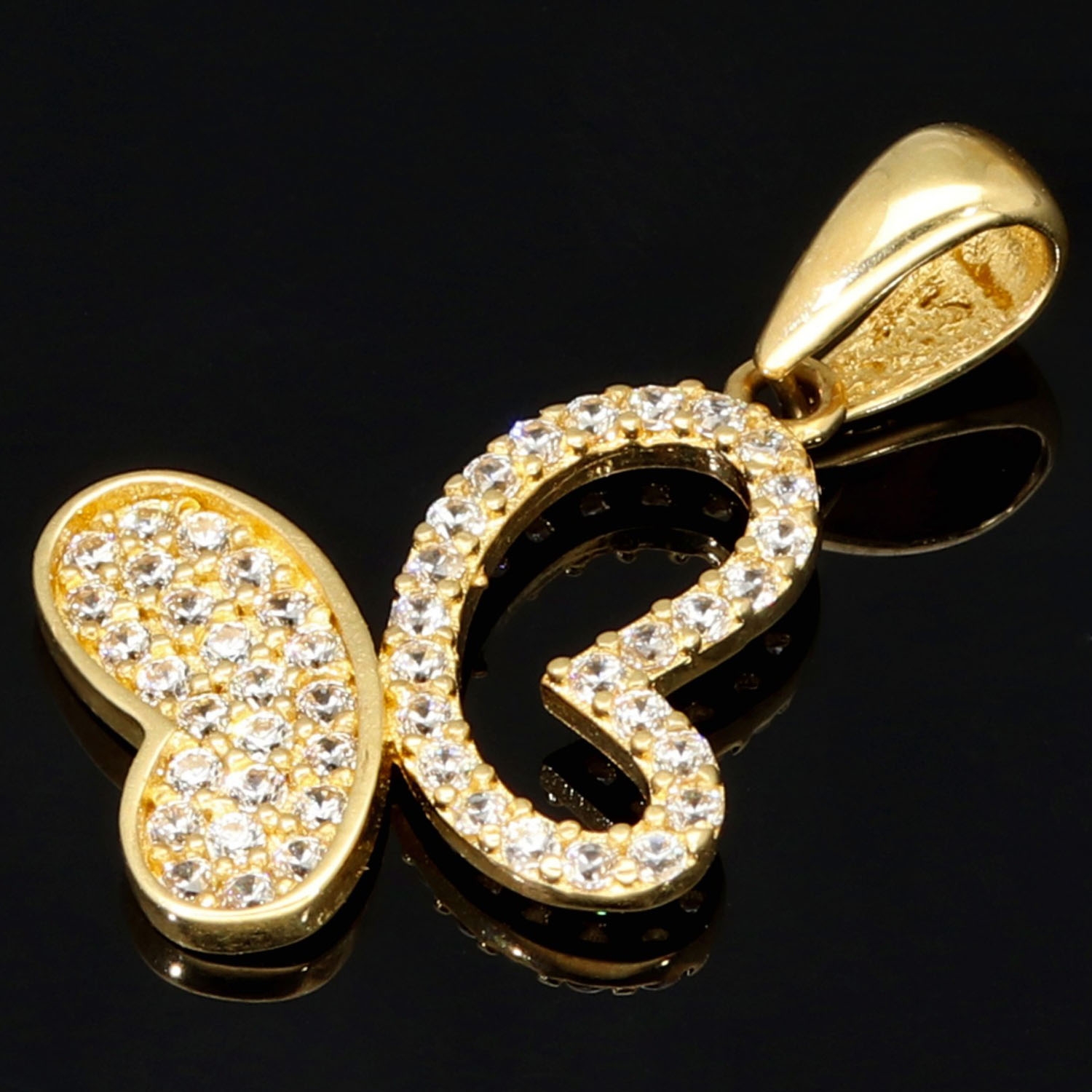 Dieser elegante Schmetterlings-Anhänger begeistert durch sein filigranes Design und sein strahlendes Funkeln. Gefertigt aus hochwertigem 585er (14 Karat) Gelbgold. Zahlreiche glänzende Zirkonia-Steine sind präzise gefasst und sorgen für ein luxuriöses Erscheinungsbild bei jeder Bewegung. Die polierte Goldoberfläche unterstreicht den edlen Charakter dieses Schmuckstücks.