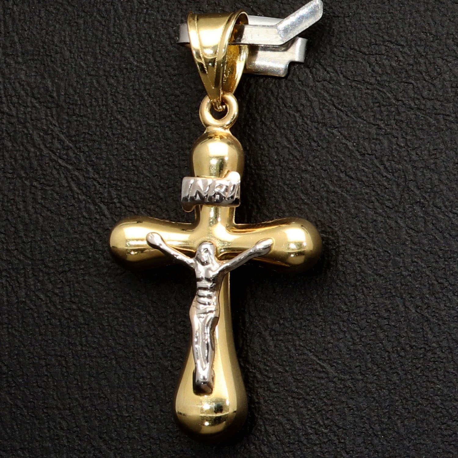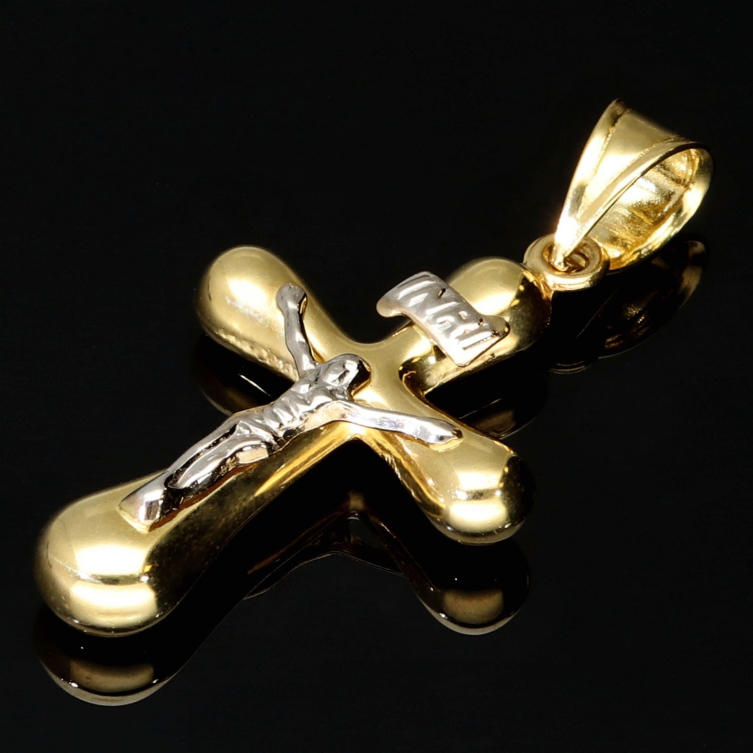 Eleganter Kreuzanhänger aus 14 K (585) Gelbgold mit fein gearbeiteter Figur in Weißgold. Die polierte Oberfläche sorgt für intensiven Glanz und ein hochwertiges Finish. Präzise gefertigt und langlebig.