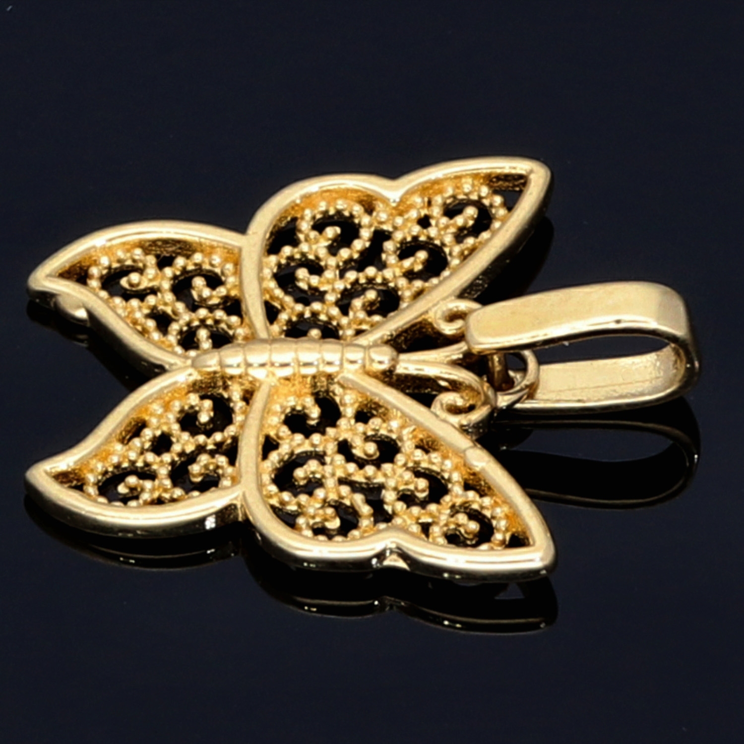 Eleganter Anhänger in Schmetterlingsform aus hochwertigem 585er (14 Karat) Gold. Das fein gearbeitete, durchbrochene Ornamentmuster verleiht dem Schmuckstück eine leichte und detailreiche Optik.
