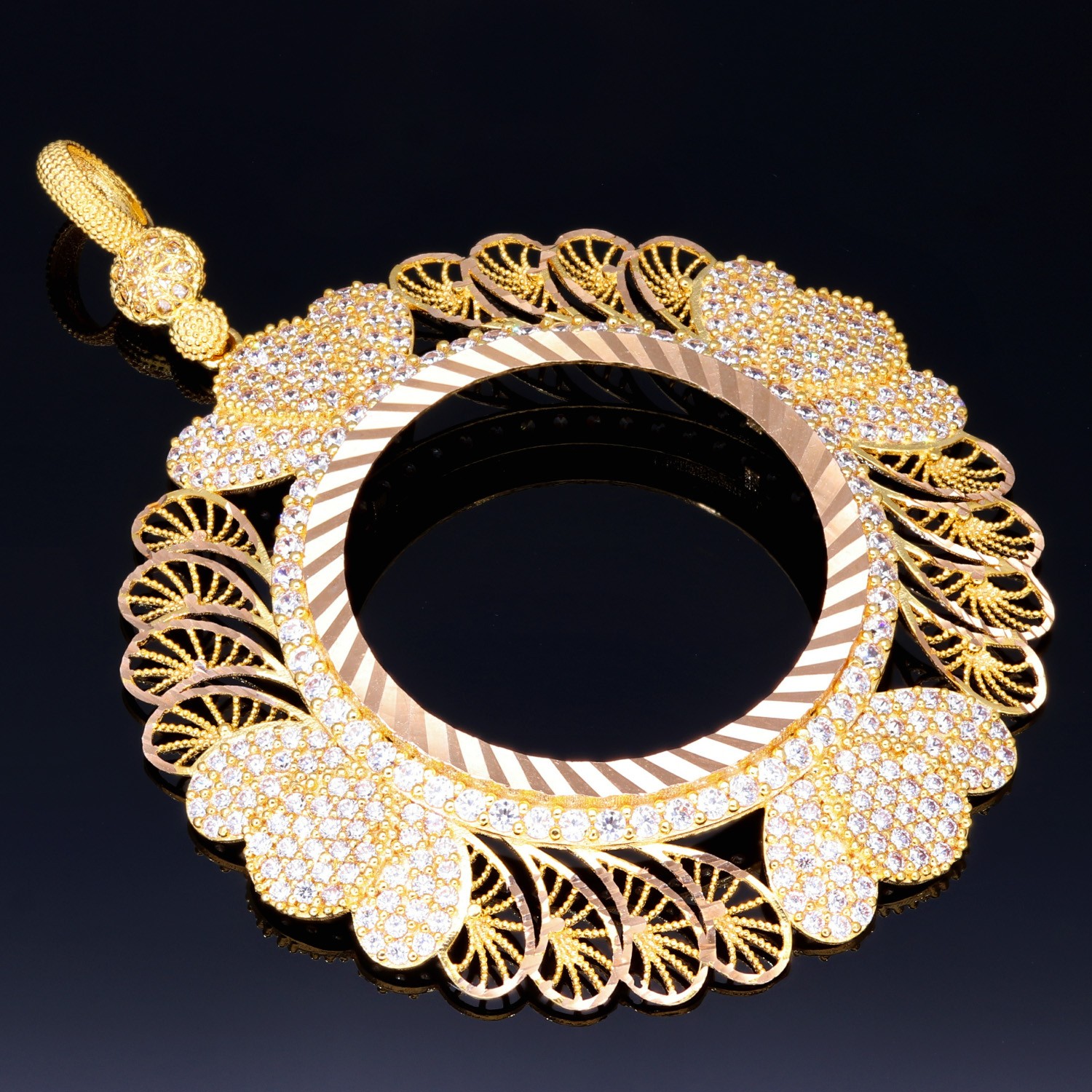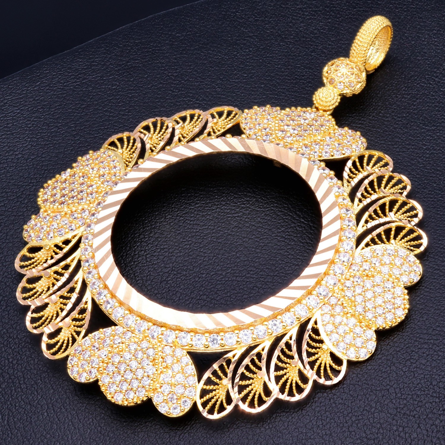 Imposanter und außergewöhnlicher Anhänger (Münzfassung) für Goldmünzen (Altin, Lira, Atatürk, Dukat) in 14k / 585 Gold mit filgranen Verzierungen, besetzt mit vielen kleinen Zirkoniasteinen
