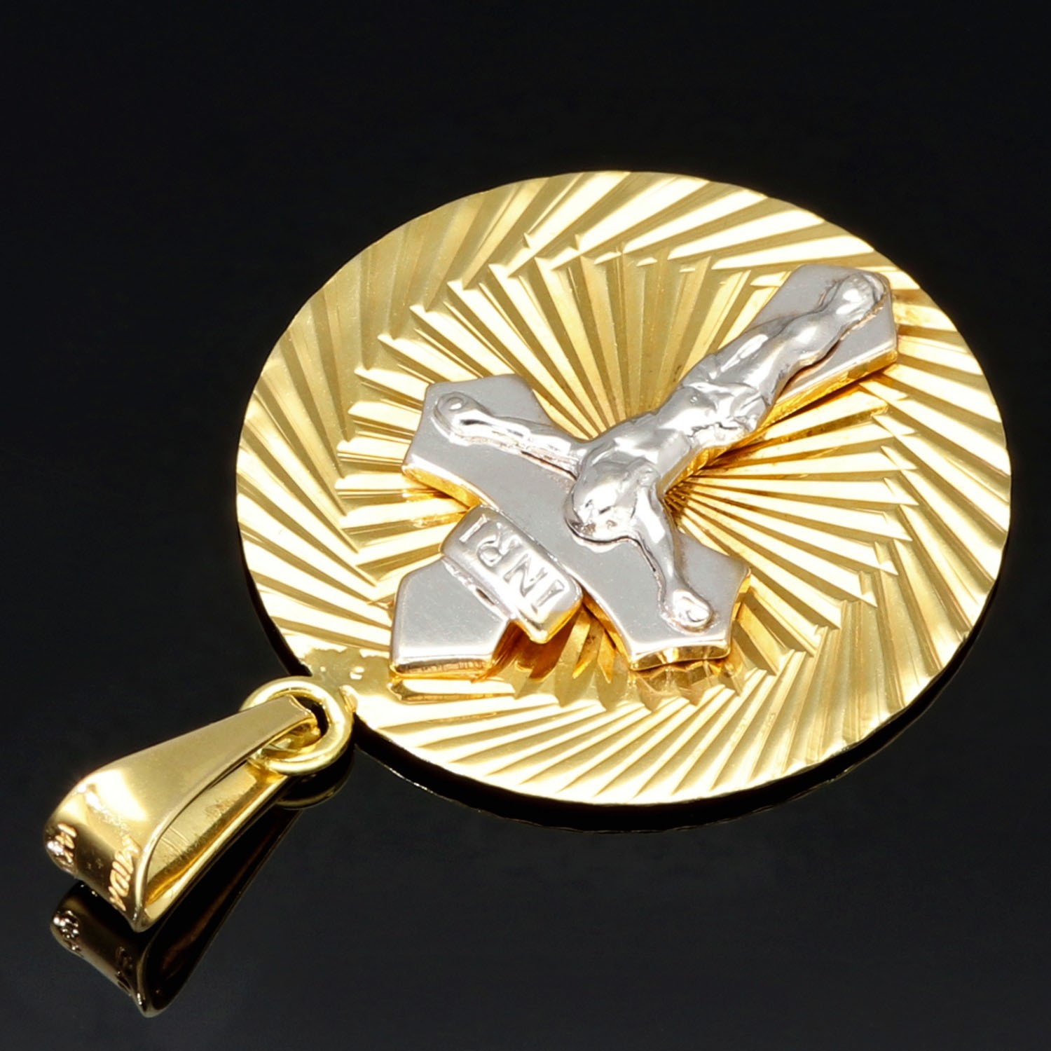Dieses edle Jesus-Kreuz-Amulett vereint spirituelle Symbolkraft mit hochwertiger Goldschmiedekunst. Der runde Anhänger aus feinem Bicolor 14 Karat (585) Weiß- und Gelbgold besticht durch sein kunstvoll gearbeitetes Design: Ein strahlenförmig gravierter Hintergrund in warmem Gelbgold verleiht dem Schmuckstück Tiefe und Ausdruck, während die plastisch hervorgehobene Kreuzdarstellung in elegantem Weißgold einen stilvollen Kontrast setzt.