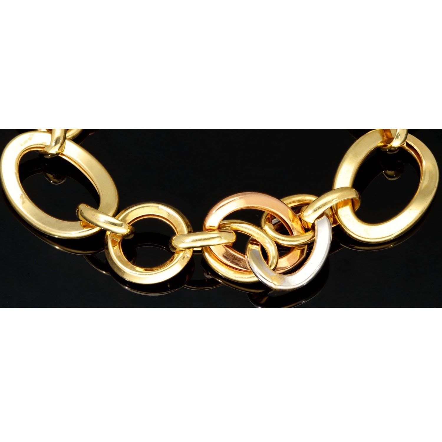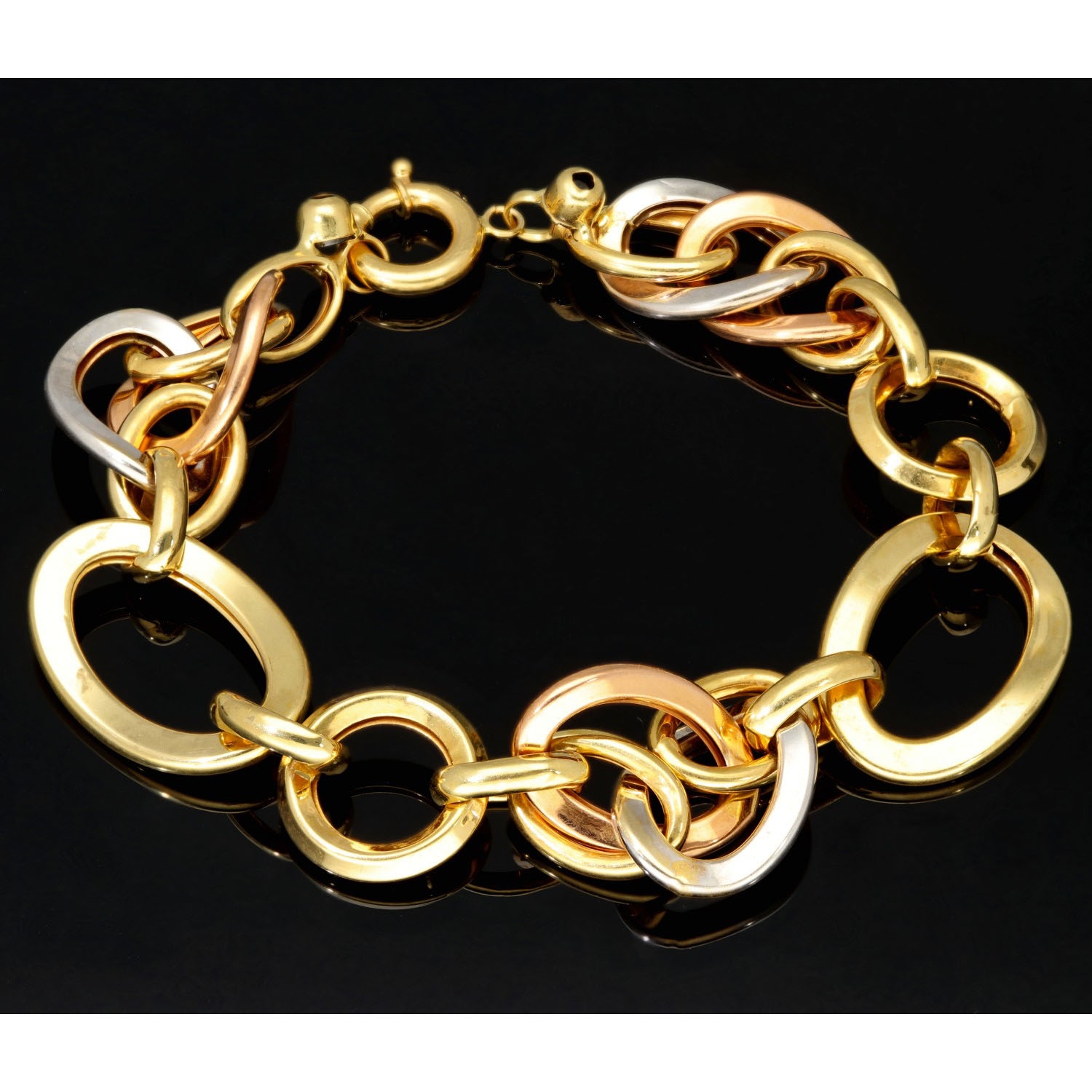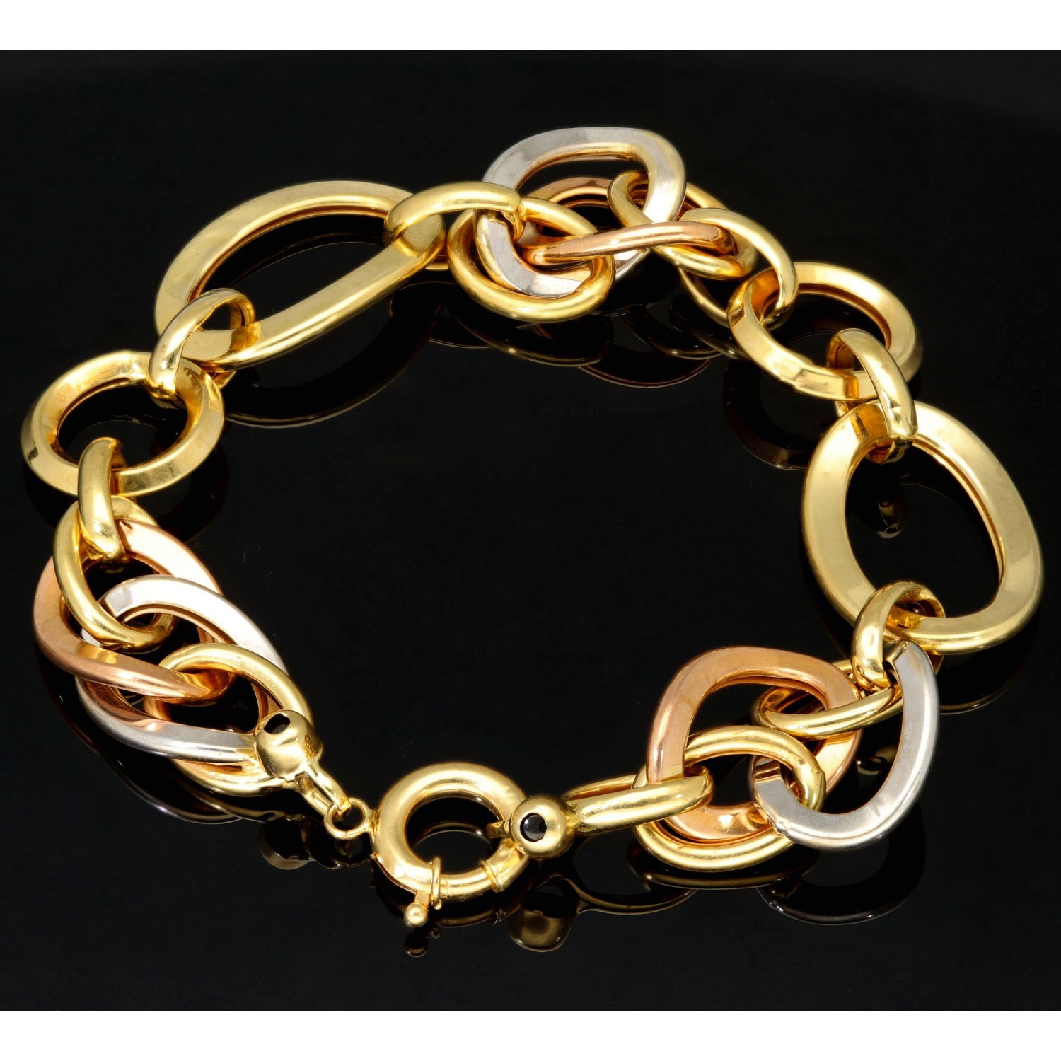 Ein stilvolles Schmuckstück in höchster Handwerkskunst: Dieses exquisite Damen-Armband besteht aus edlem 585er (14 Karat) Tricolor-Gold – eine harmonische Kombination aus Gelbgold, Roségold und Weißgold. Die unterschiedlichen Goldtöne verleihen dem Armband eine luxuriöse, moderne Ausstrahlung und machen es zum stilvollen 10 überschriften mit gleich vielen wortzen ungefährAccessoire. Die großen, ineinander verschlungenen Glieder setzen ein raffiniertes Design-Statement und sorgen für einen edlen Glanz.