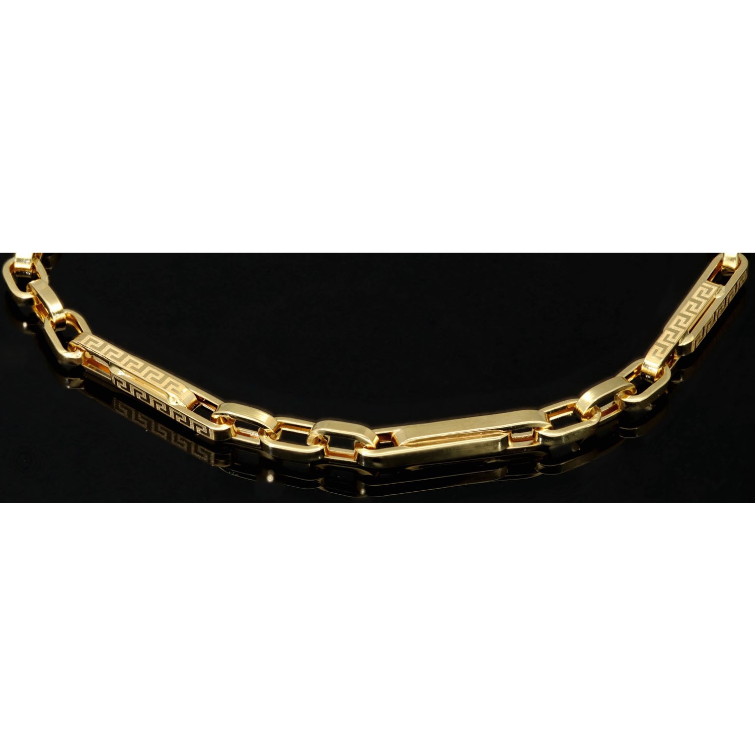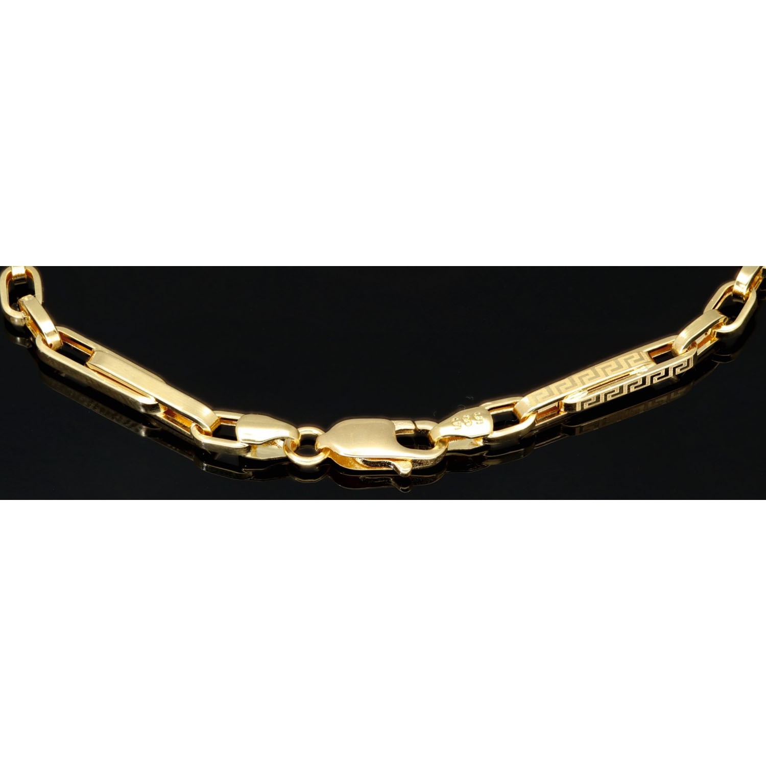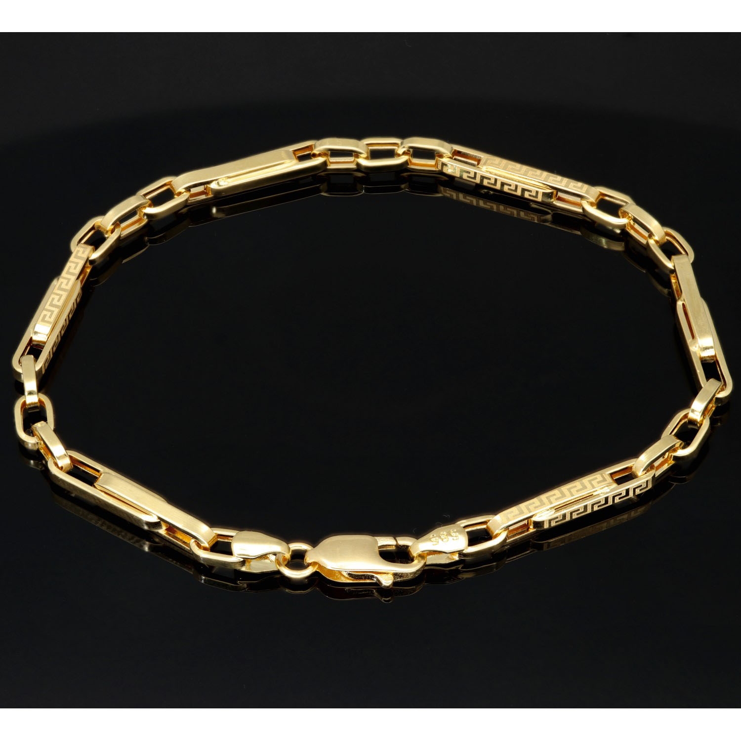 Dieses edle Armband aus hochwertigem 585er (14 Karat) Gold überzeugt durch seine elegante Linienführung und das kunstvoll eingravierte Greco-Design, das dem Schmuckstück eine zeitlos klassische Note verleiht. Die fein gearbeiteten Glieder sorgen nicht nur für eine stilvolle Optik, sondern auch für eine angenehme Beweglichkeit und einen hohen Tragekomfort.