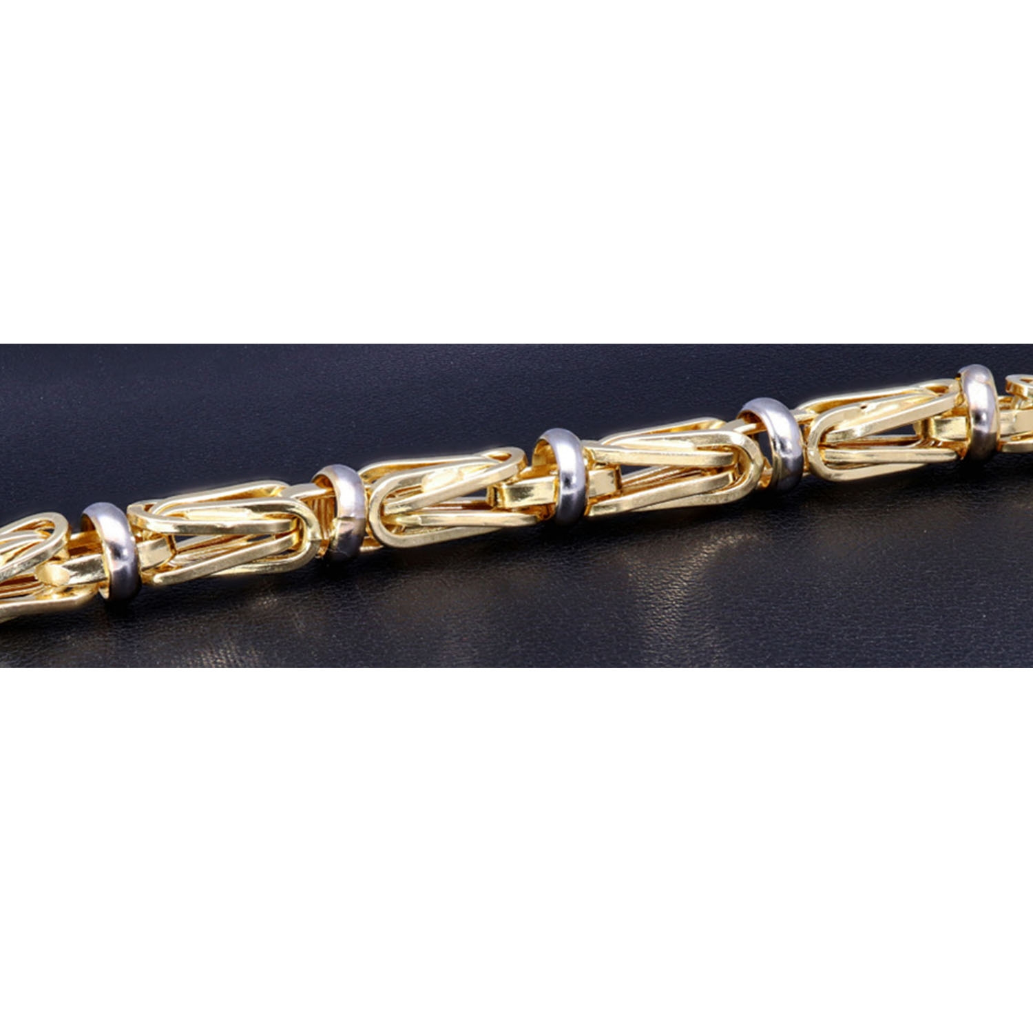 Gefertigt aus hochwertigem 585er Gold (14 Karat), besticht das Armband durch den harmonischen Kontrast aus warmem Gelbgold und kühlen Weißgold-Akzenten. Die aufwendig gearbeitete Struktur sorgt für ein faszinierendes Lichtspiel und macht dieses Schmuckstück zu einem echten Blickfang – sowohl im Alltag als auch zu besonderen Anlässen.