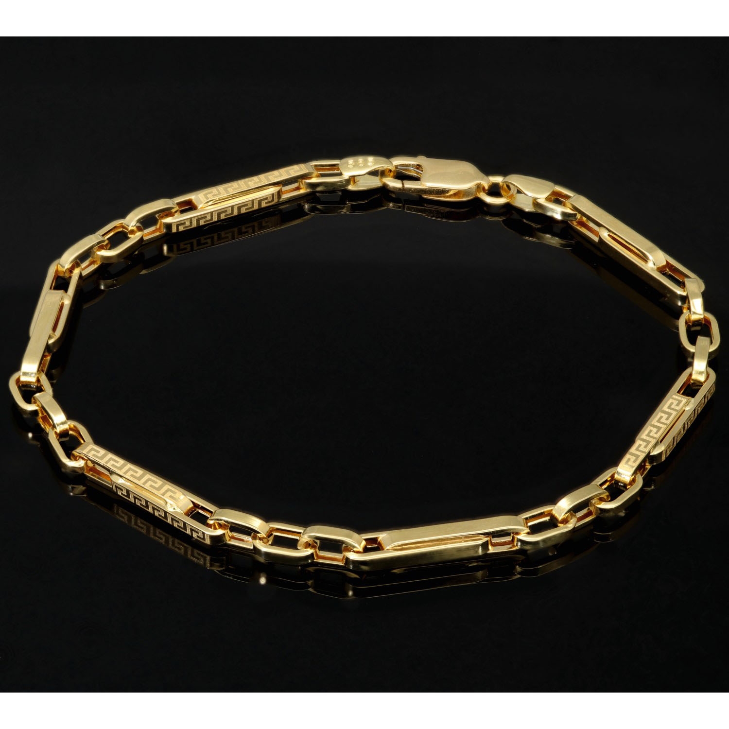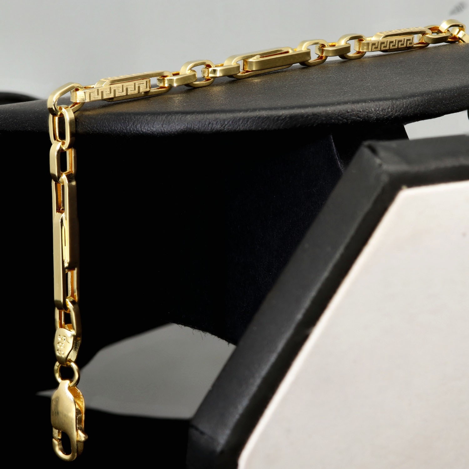 Dieses edle Armband aus hochwertigem 585er (14 Karat) Gold überzeugt durch seine elegante Linienführung und das kunstvoll eingravierte Greco-Design, das dem Schmuckstück eine zeitlos klassische Note verleiht. Die fein gearbeiteten Glieder sorgen nicht nur für eine stilvolle Optik, sondern auch für eine angenehme Beweglichkeit und einen hohen Tragekomfort.