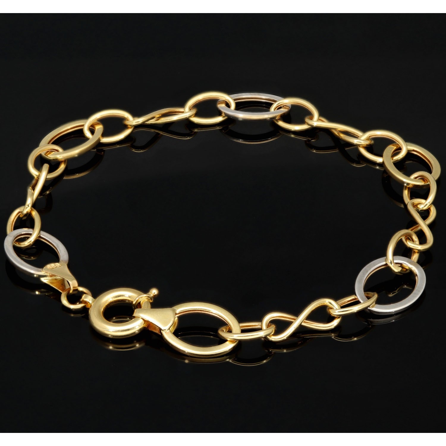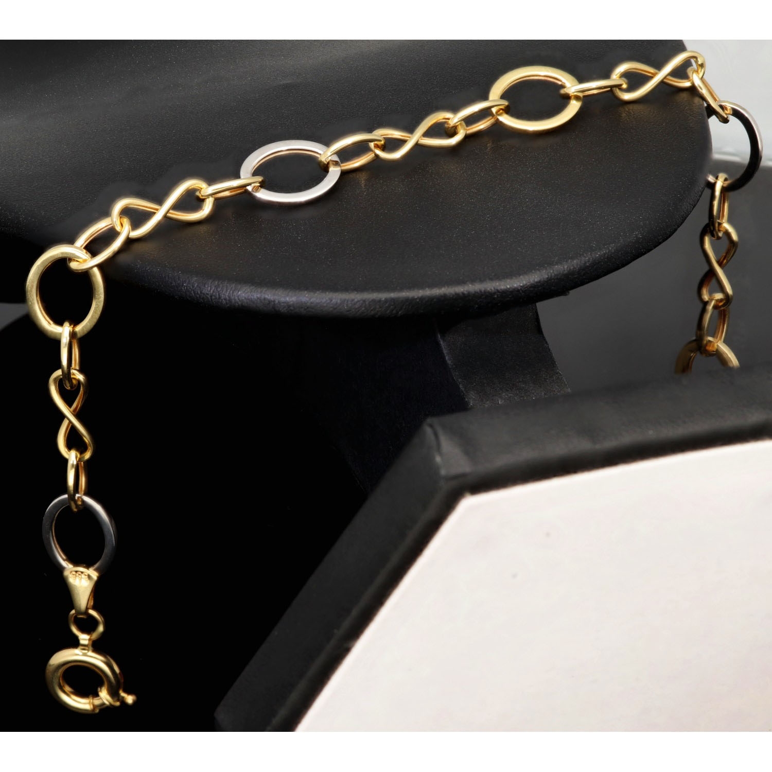 Dieses hochwertige Armband besteht aus 14K (585) Gelb- und Weißgold und verbindet klassische Ankerkettenglieder mit fein gearbeiteten Bicolor-Elementen. Die polierte Oberfläche sorgt für einen eleganten Glanz, während die unterschiedlichen Gliedformen dem Schmuckstück eine moderne und zugleich zeitlose Optik verleihen.