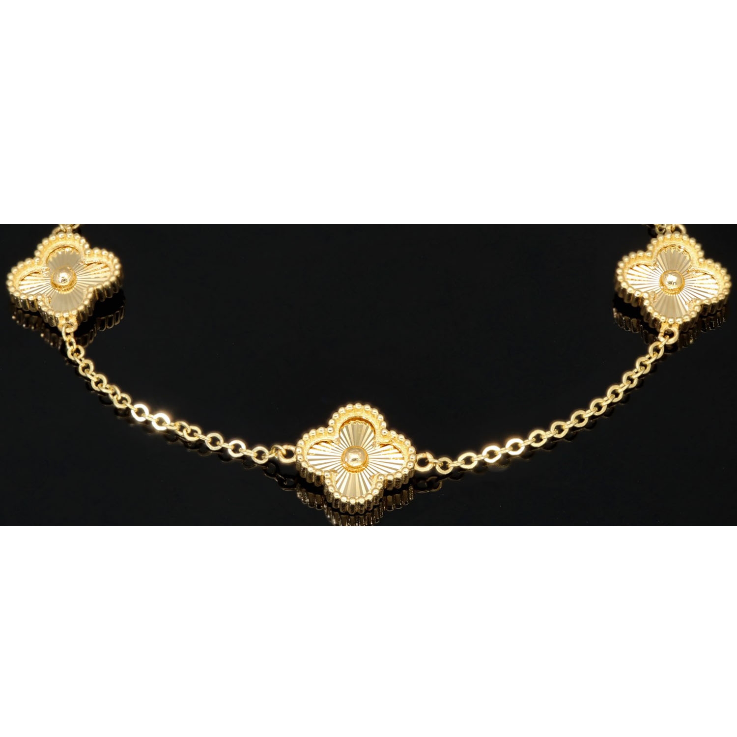 Dieses edle Armband aus feinstem 585er (14 Karat) Gelbgold besticht durch sein zartes, feminines Design. Drei fein gearbeitete Kleeblatt-Elemente symbolisieren Glück und Eleganz zugleich. Die detailreiche Struktur und die glänzende Oberfläche verleihen dem Schmuckstück eine luxuriöse Ausstrahlung.