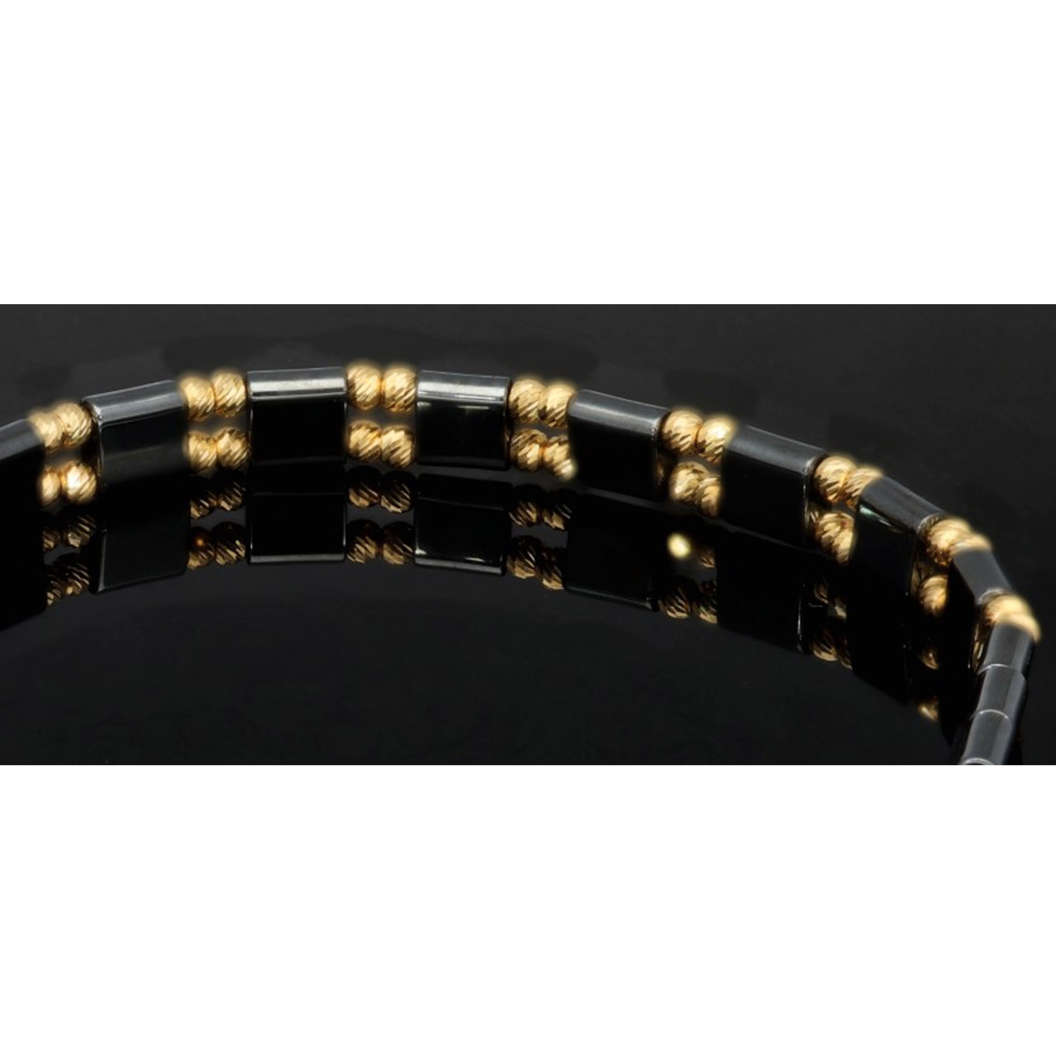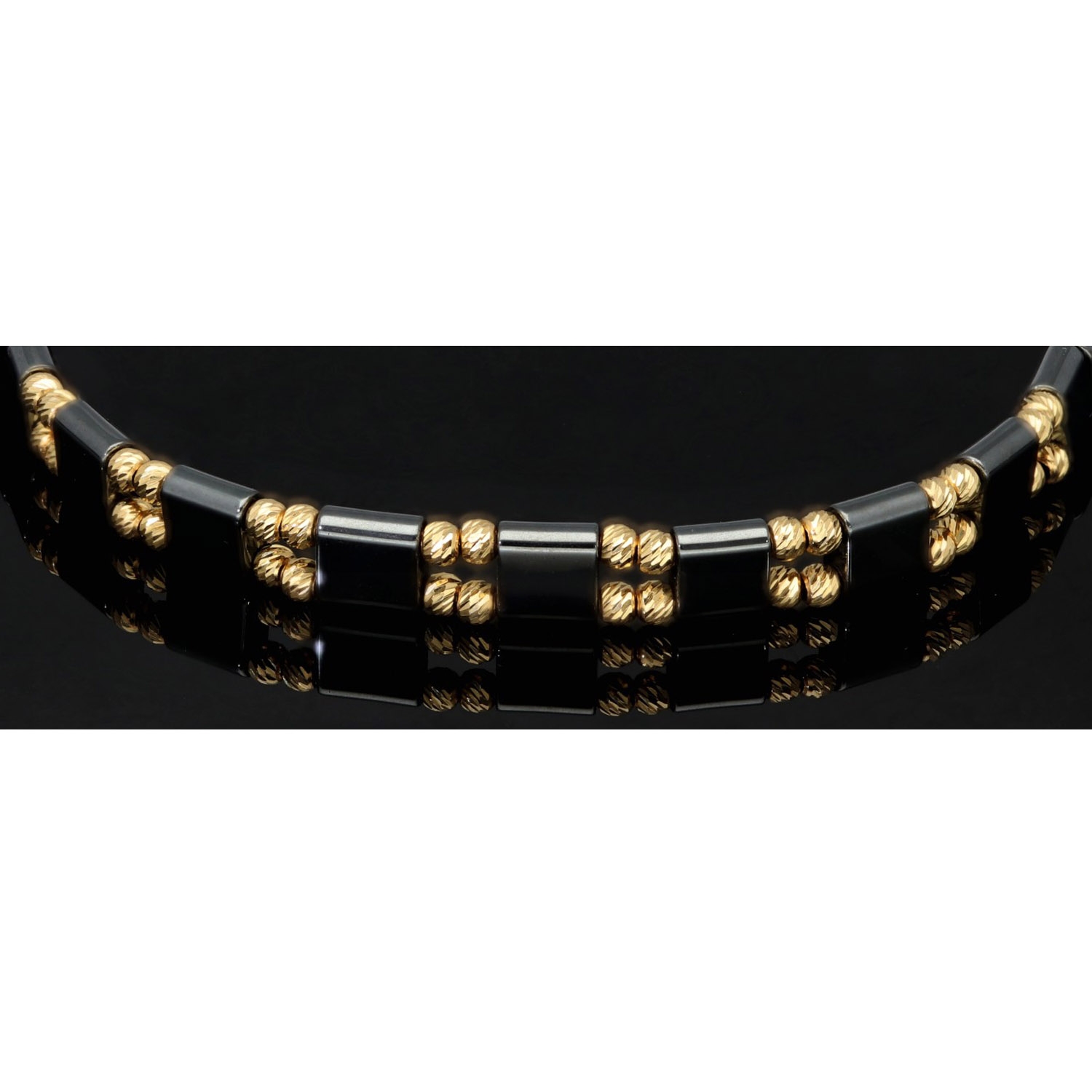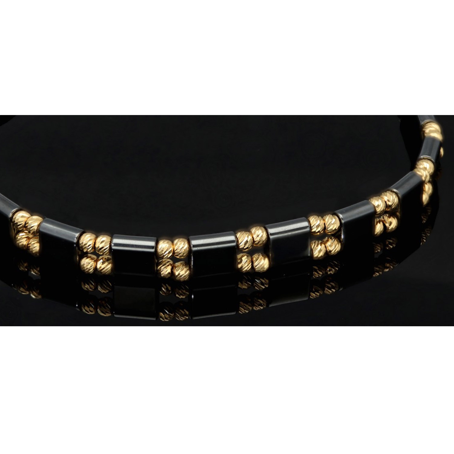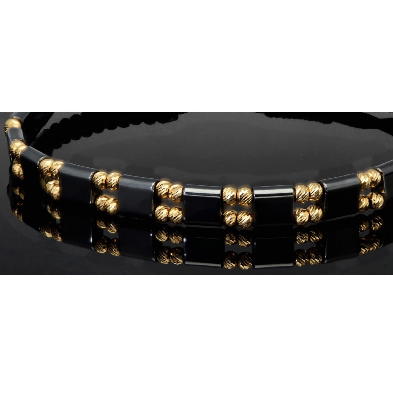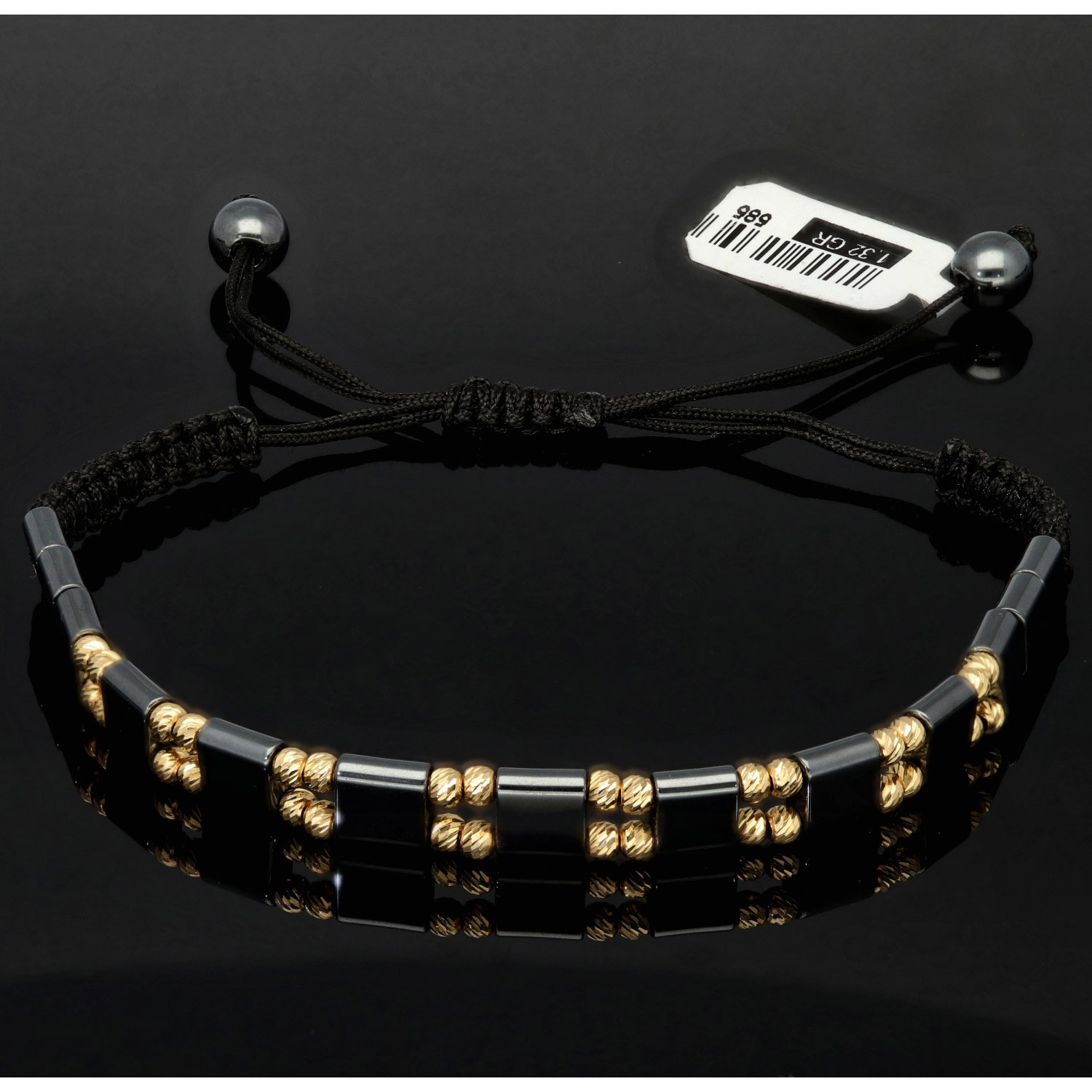 Dieses stilvolle, längenverstellbare Kugel-Zug-Armband vereint edles Design mit hochwertiger Verarbeitung. Es besteht aus 32 feinen Perlen aus echtem 585 / 14K Gold, kombiniert mit glänzenden, grauschwarzen Beads aus Hämatit, die dem Schmuckstück einen modernen, kontrastreichen Look verleihen.