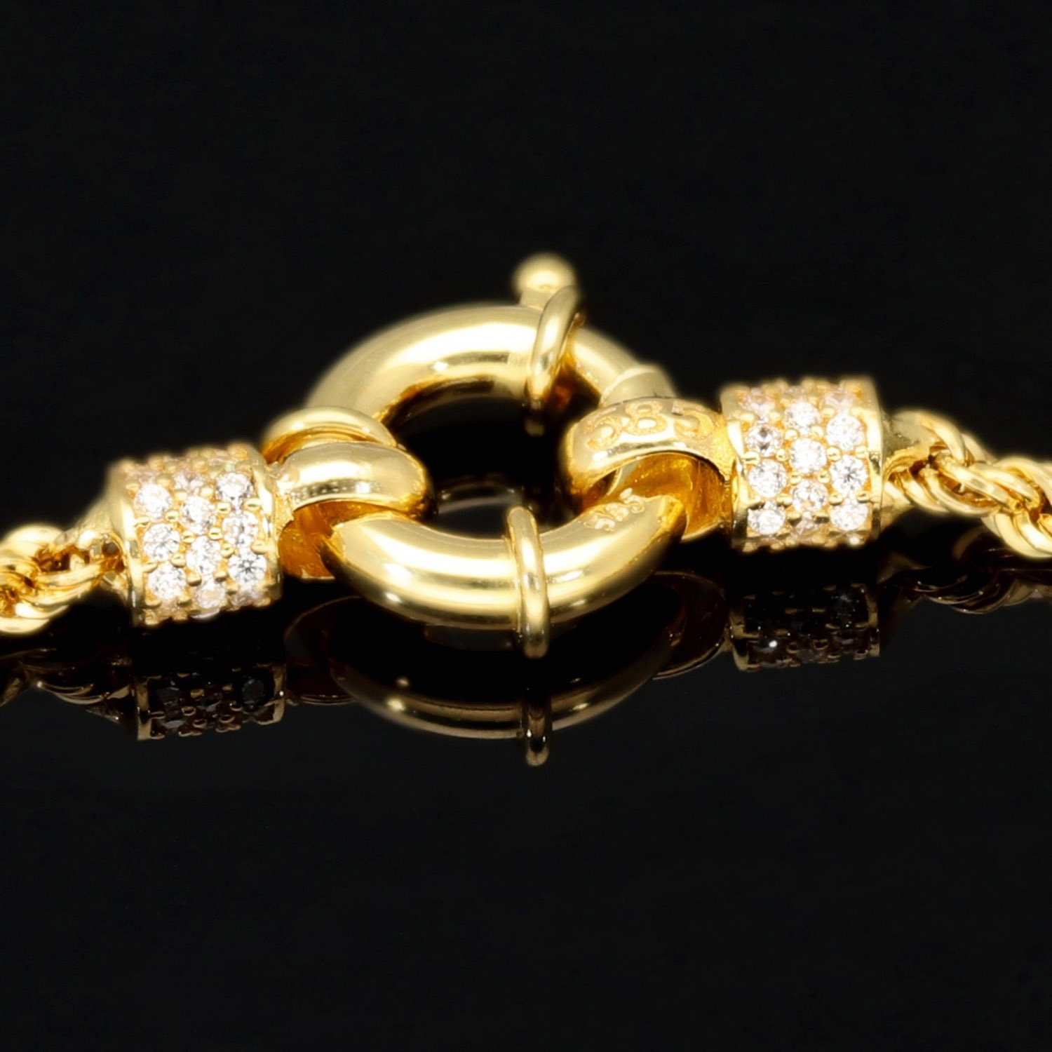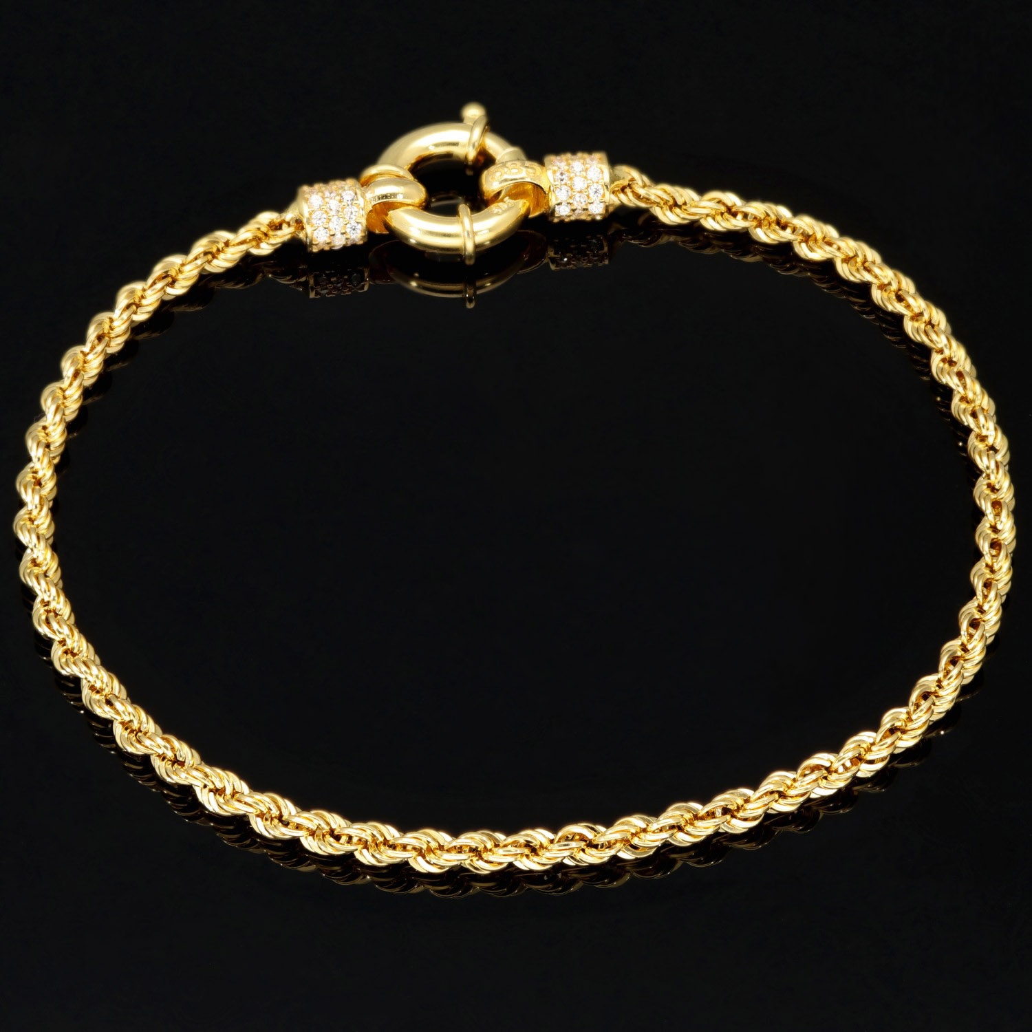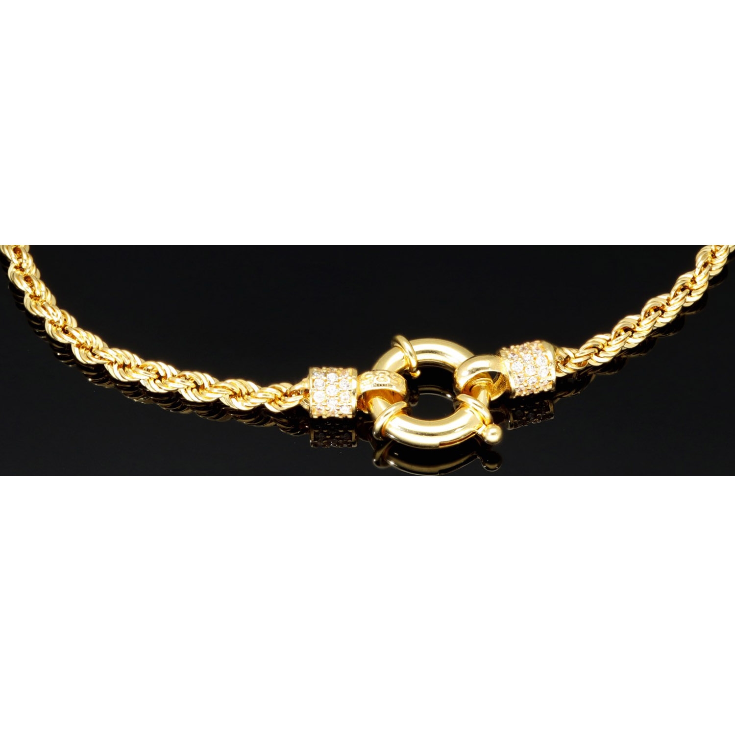 Ein elegantes Schmuckstück mit modernem Twist: Dieses filigrane Kordelarmband aus hochwertigem 585er (14 Karat) Gelbgold begeistert durch seine fein gedrehte Struktur und die funkelnden Zirkonia-besetzten Rondellen, die dem Design einen Hauch von Glamour verleihen.Die Twist-Optik (ca. 2,5 mm breit) verleiht dem Armband ein lebendiges Lichtspiel und eine luxuriöse Ausstrahlung – sowohl einzeln getragen als auch im Layering mit anderen Armbändern. Der große Federringverschluss mit zwei glitzernden Rondellen sorgt für sicheren Halt und rundet das Design stilvoll ab.