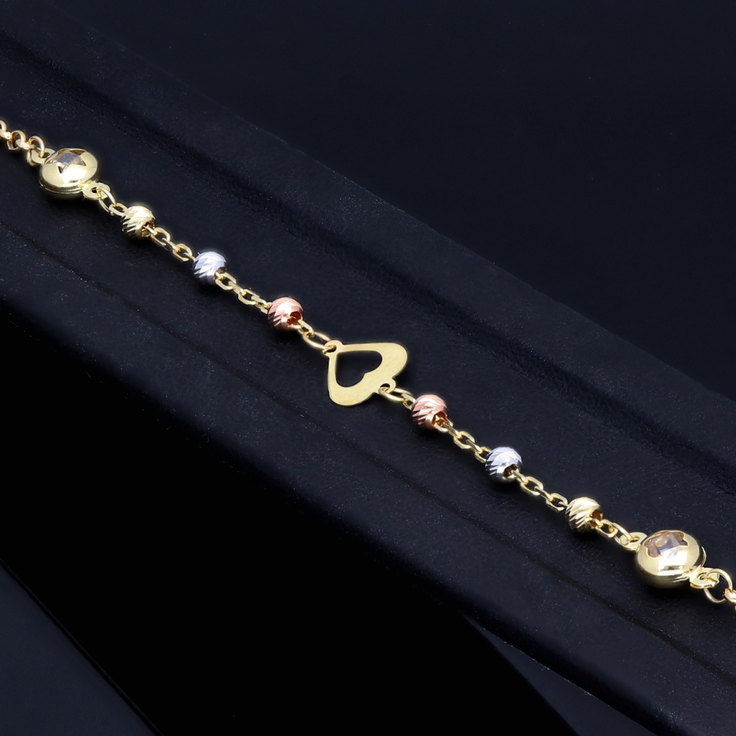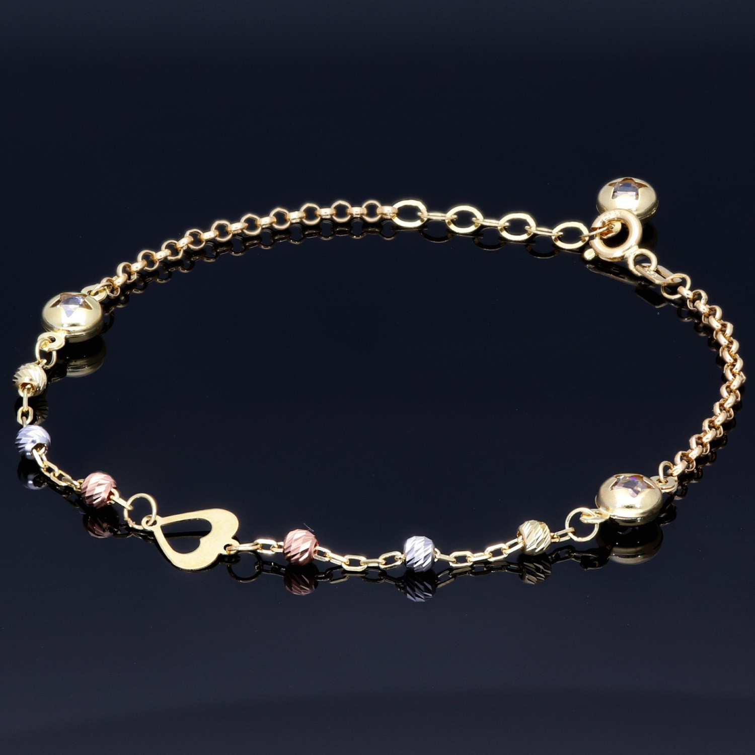 Im Mittelpunkt steht ein filigranes Herz-Element, das dem Schmuckstück eine liebevolle, verspielte Note verleiht. Kleine, facettierte Kugeln in Tricolor-Optik sorgen für funkelnde Akzente und unterstreichen die besondere Raffinesse des Designs.