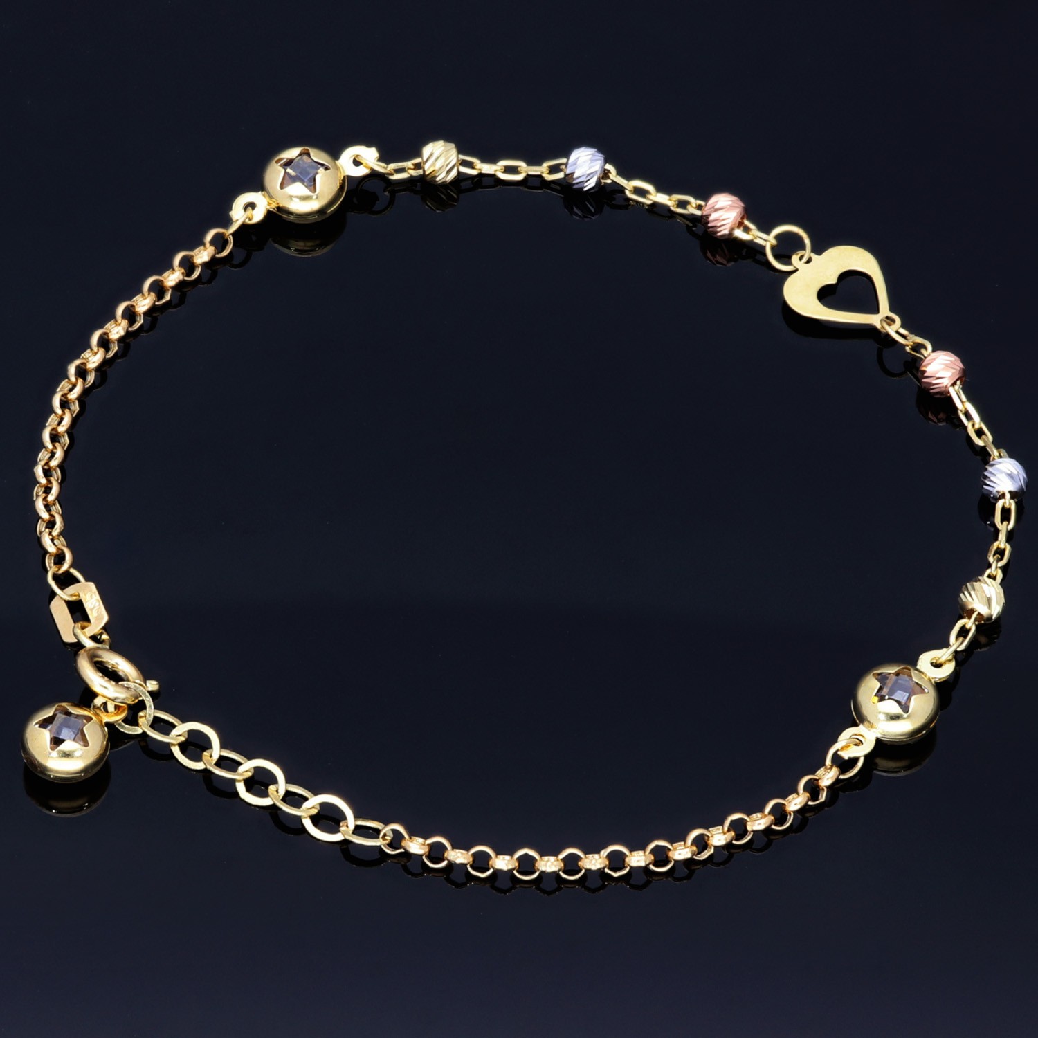 Ein elegantes Armband, das mit seiner feinen Verarbeitung und seinem charmanten Design sofort ins Auge fällt. Gefertigt aus hochwertigem 585er (14 Karat) Gold, kombiniert es elegant drei Goldtöne – Gelbgold, Weißgold und Roségold – zu einem harmonischen Gesamtbild.