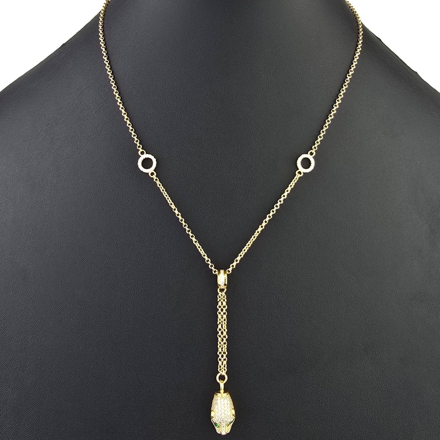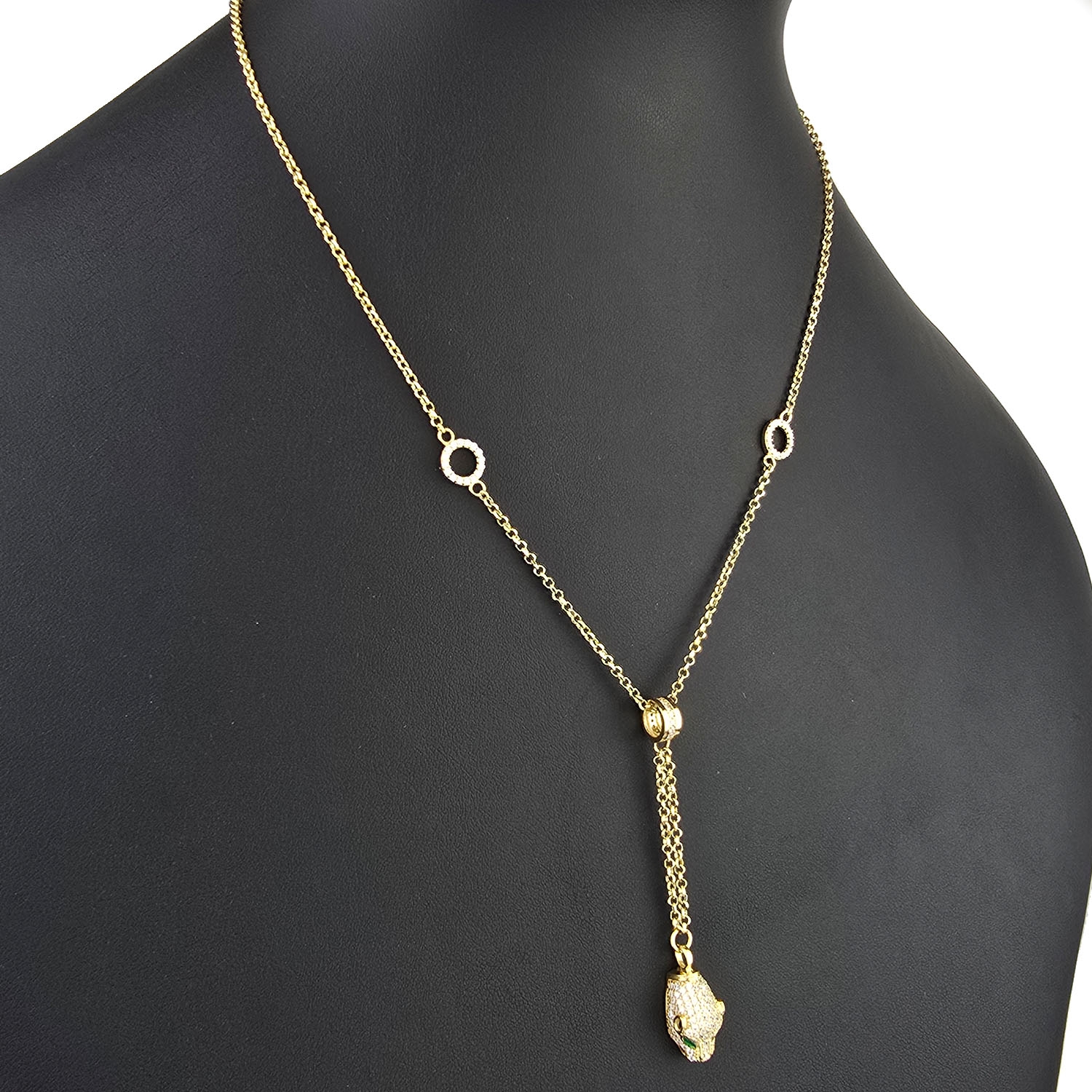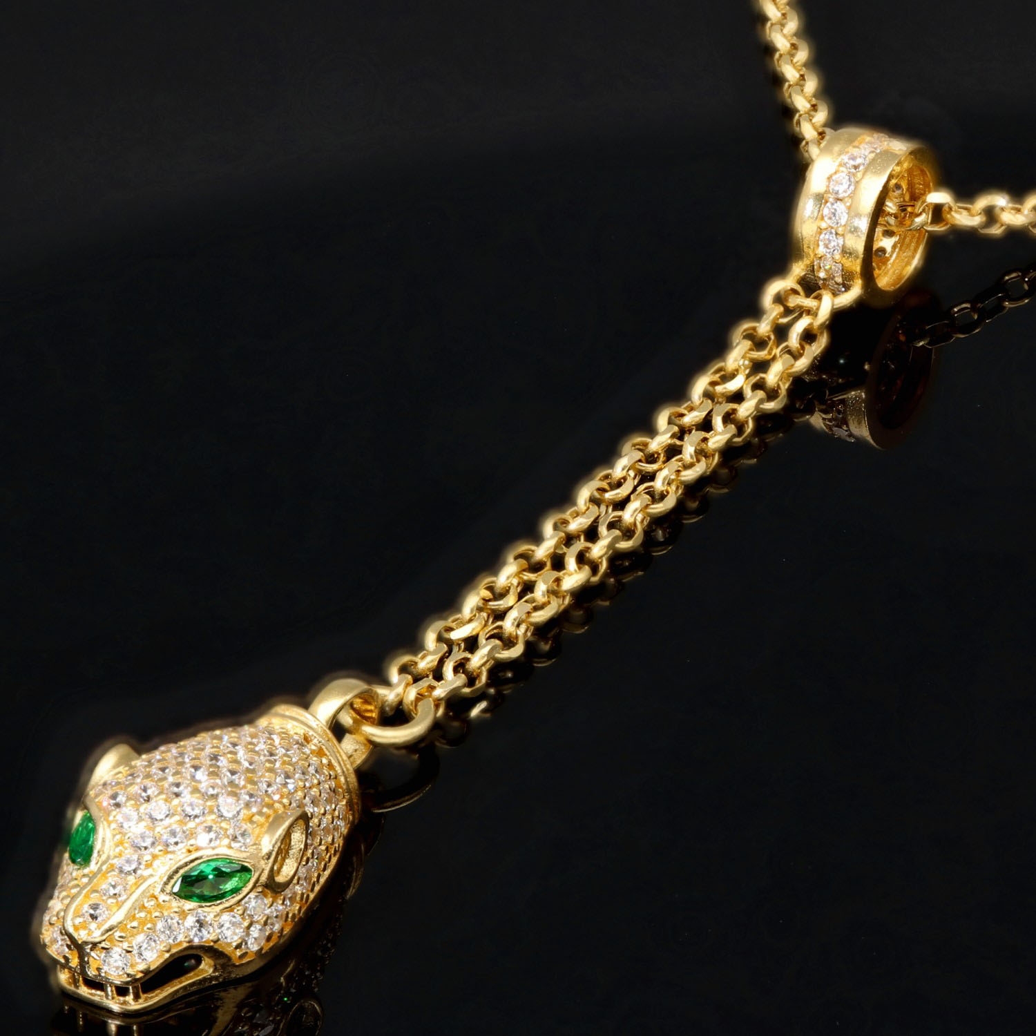 Dieses elegante Collier aus hochwertigem 14 Karat (585) Gelbgold besticht durch seinen luxuriösen Glanz und seinem außergewöhnlichen Design. Der kunstvoll gestaltete Pantherkopf-Anhänger ist mit zahlreichen funkelnden Zirkonia-Steinen besetzt, die dem Schmuckstück ein intensives Strahlen verleihen. Besonders auffällig sind die leuchtend grünen Augen, die dem Panther einen besonderen Look verleihen.