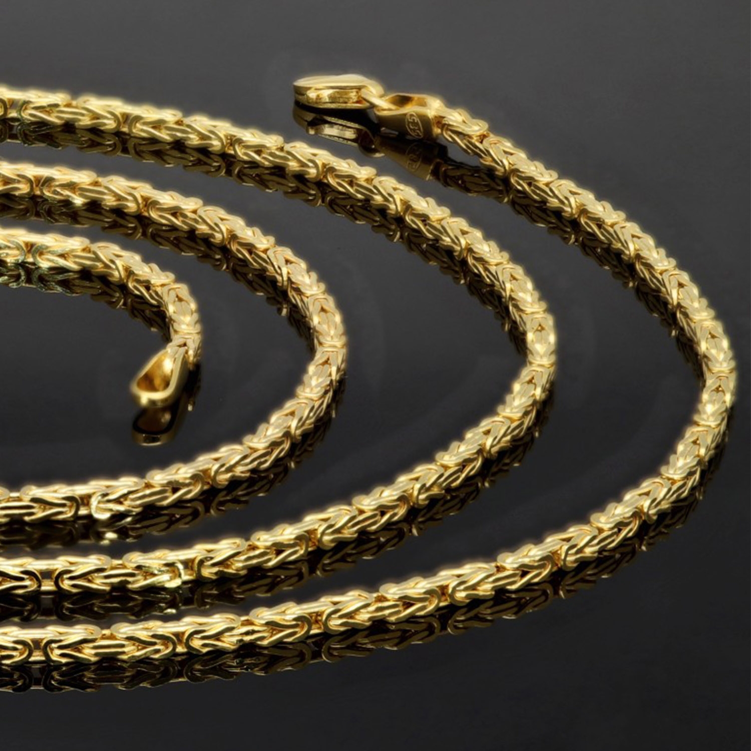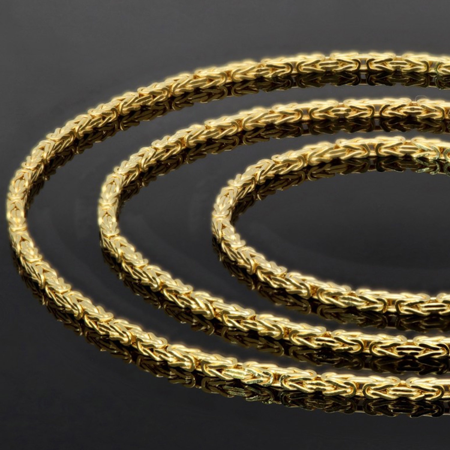 Diese hochwertige Königskette aus fein poliertem 585er Gelbgold (14 Karat) überzeugt durch ihre stilvolle Optik und präzise Verarbeitung. Die charakteristische Flechtstruktur mit exakt ineinandergreifenden Gliedern verleiht der Kette ein ausgewogenes Erscheinungsbild und eine elegante, dezente Wirkung.