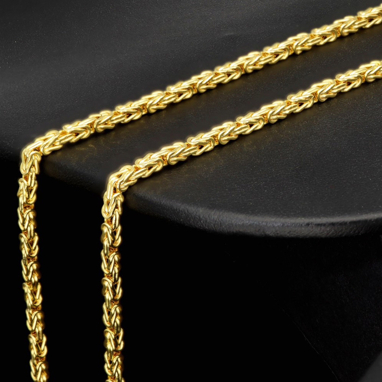 Exklusiv gefertigte Königskette aus edlem 585er Gold (14 Karat) – ein zeitloses Schmuckstück mit eleganter Ausstrahlung und feiner Verarbeitung. Mit einer Länge von ca. 45 cm und einer Breite von 2 mm überzeugt sie durch ihre dezente, dennoch markante Optik und hohe Alltagstauglichkeit.