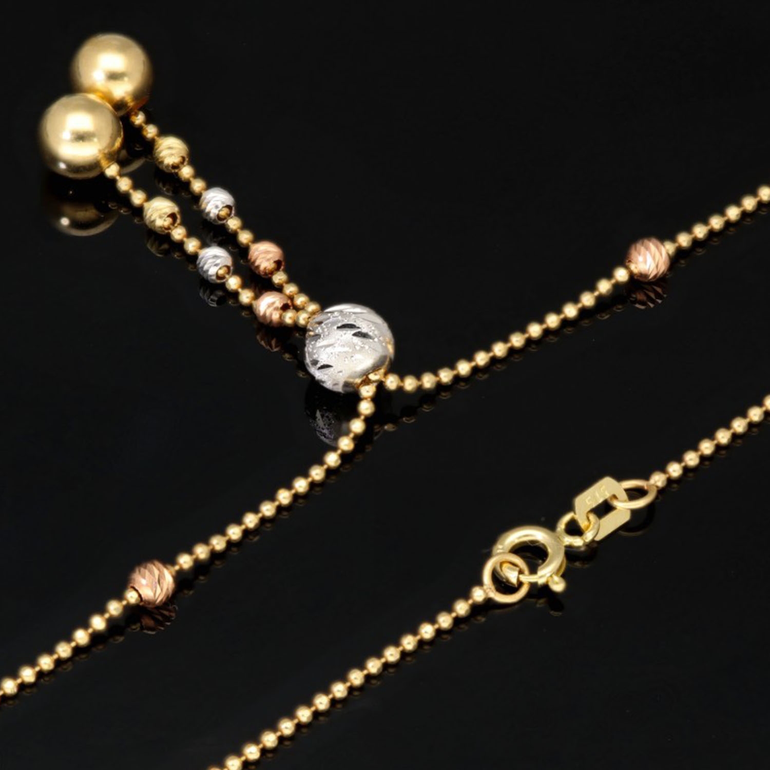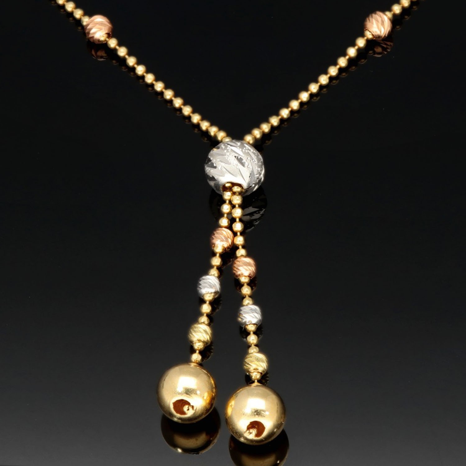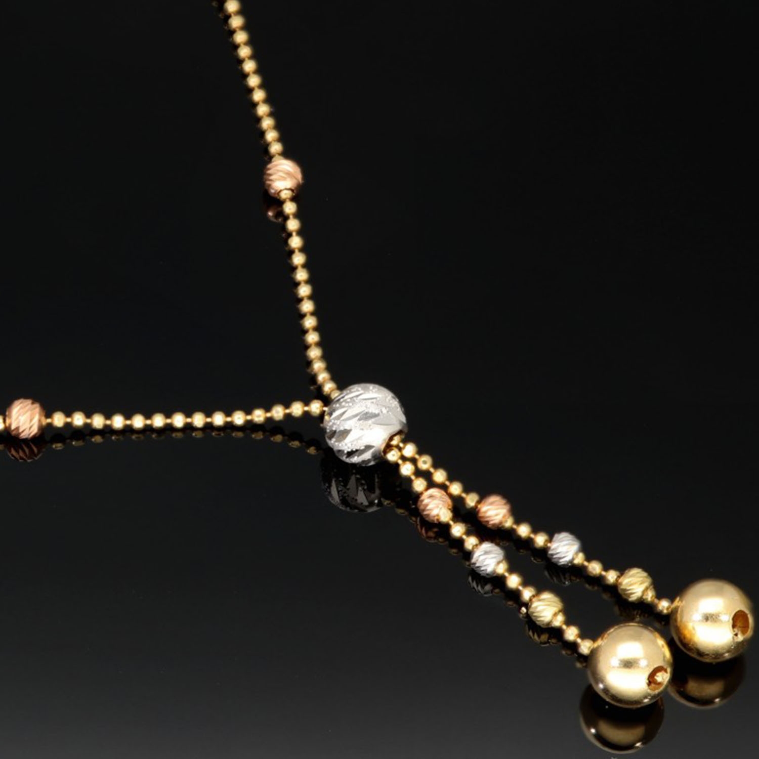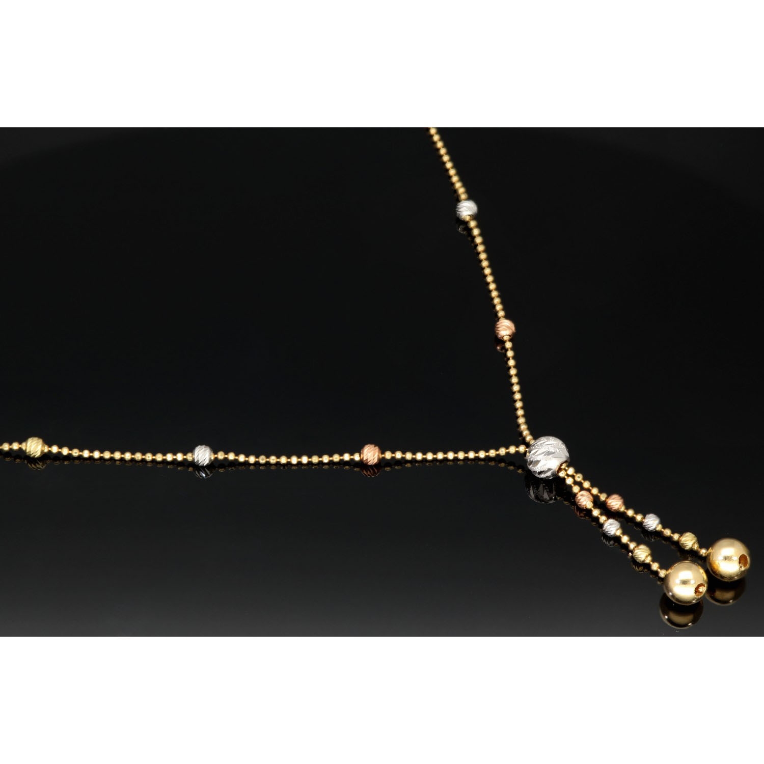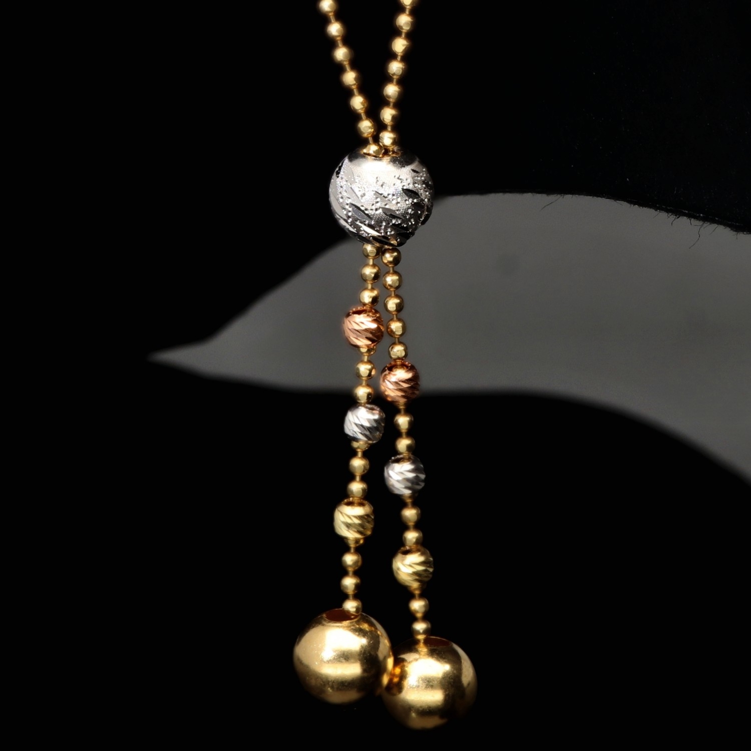 Diese edle Y-Kette vereint zeitlose Eleganz mit feiner Detailarbeit. Gefertigt aus hochwertigem 14K (585) Gold, ist sie mit mehreren sorgfältig gearbeiteten Goldkügelchen in Tricolor bestückt – Gelbgold, Weißgold und Roségold harmonieren hier zu einem besonders stilvollen Gesamtbild. Die filigrane Kugelkette mündet in einen dekorativen Y-Abschluss mit dezentem Quastencharakter, der dem Design Leichtigkeit und eine moderne Note verleiht.