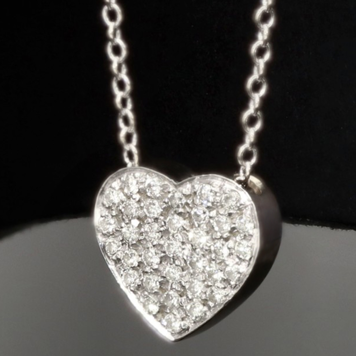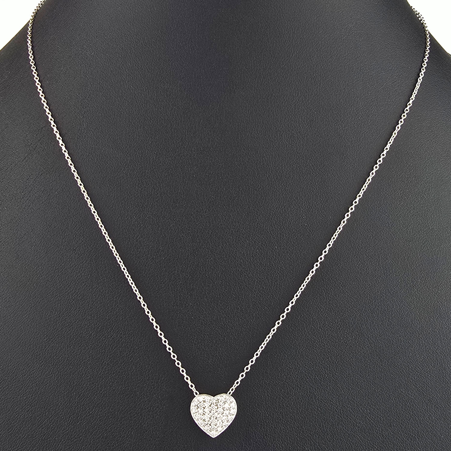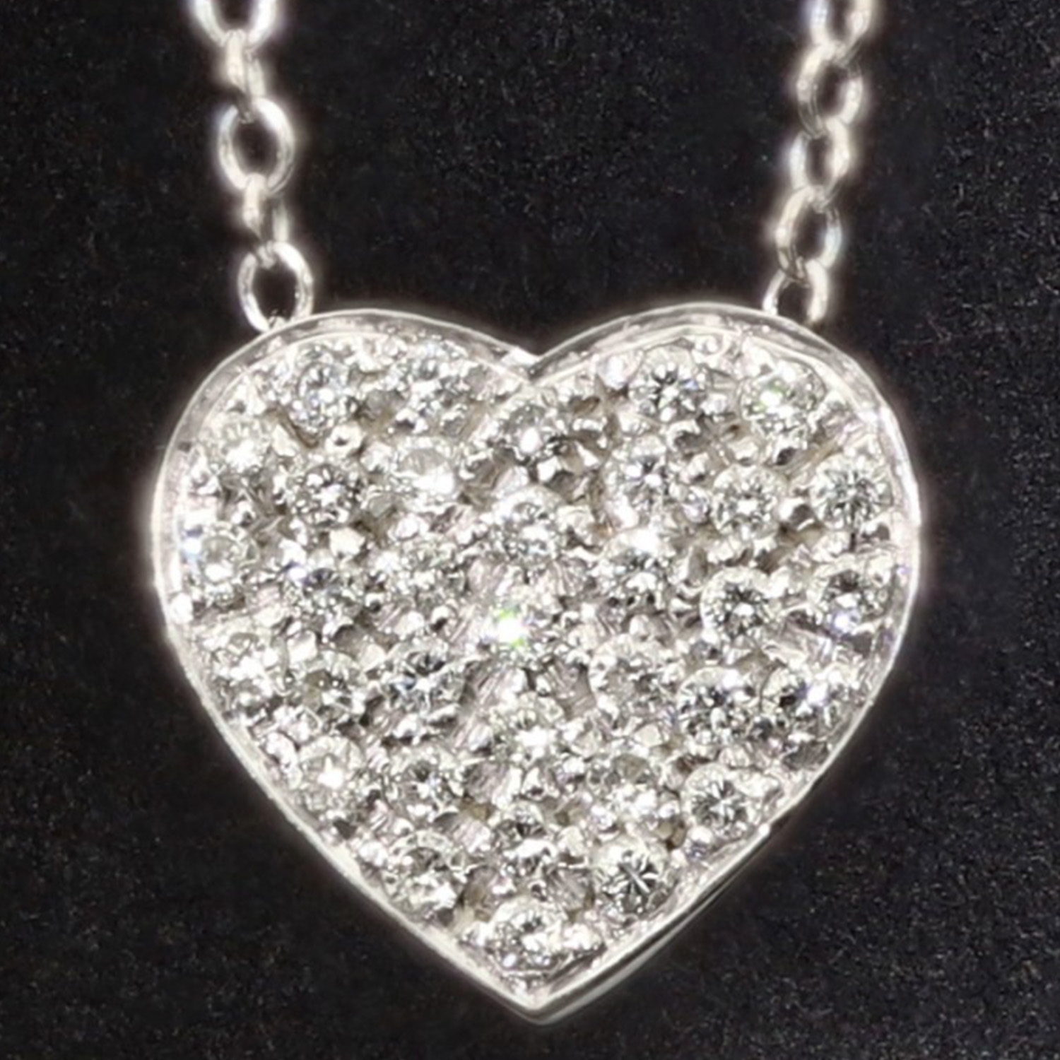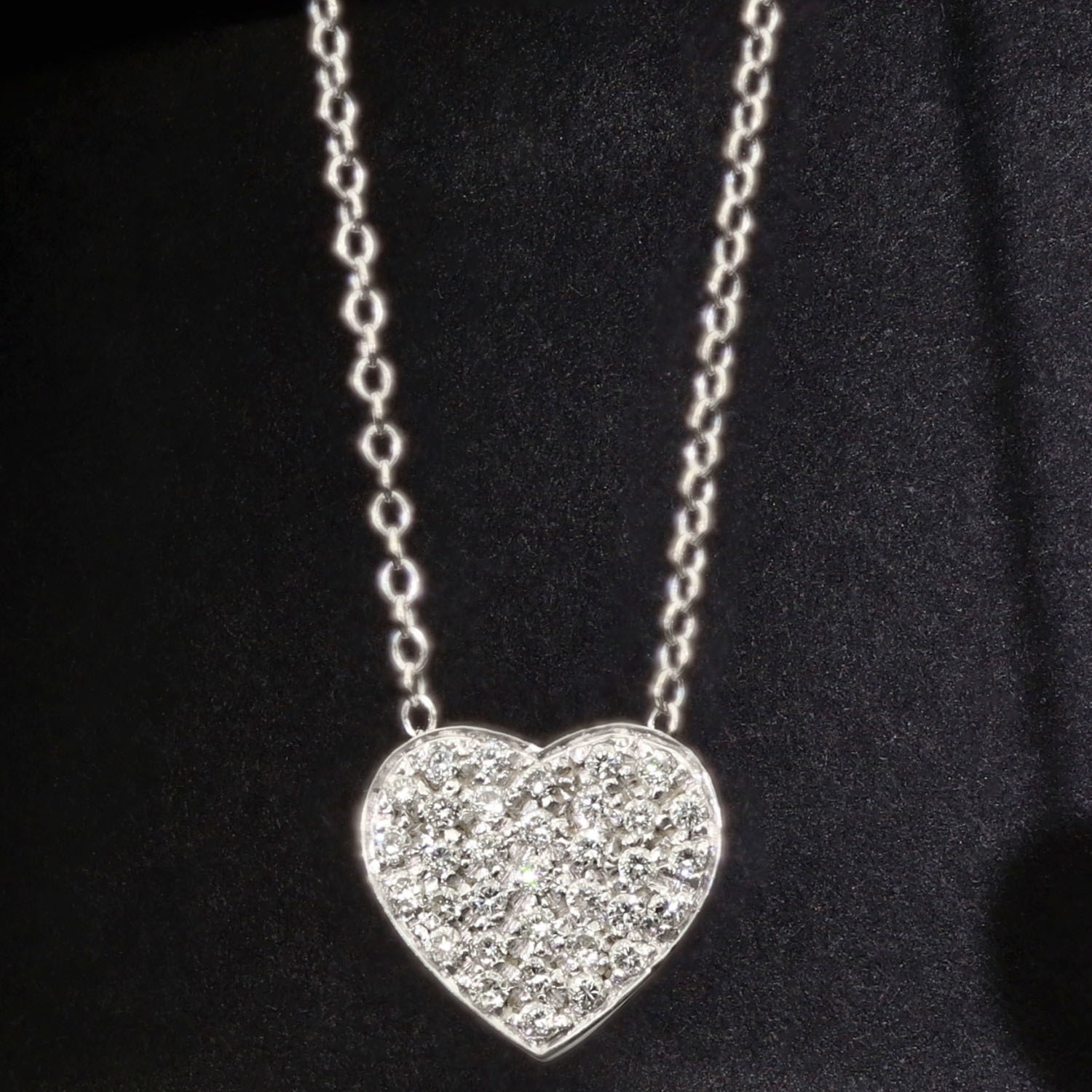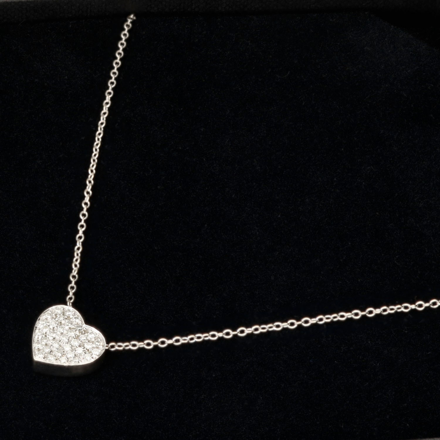 Dieses Schmuck-Set umfasst eine 18K (750) Weißgold-Ankerkette mit einer Länge von ca. 45 cm sowie einen Herz-Anhänger, der dicht mit Diamanten besetzt ist. Die Oberfläche des Anhängers zeigt eine gleichmäßige, funkelnde Struktur durch die Vielzahl der gefassten Steine. Die Kette und der Anhänger sind präzise verarbeitet und aufeinander abgestimmt.