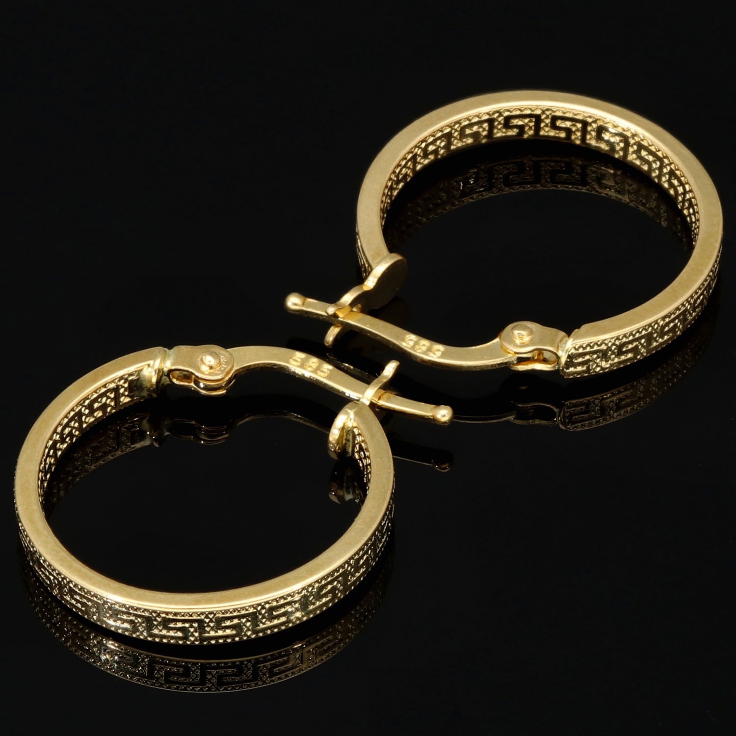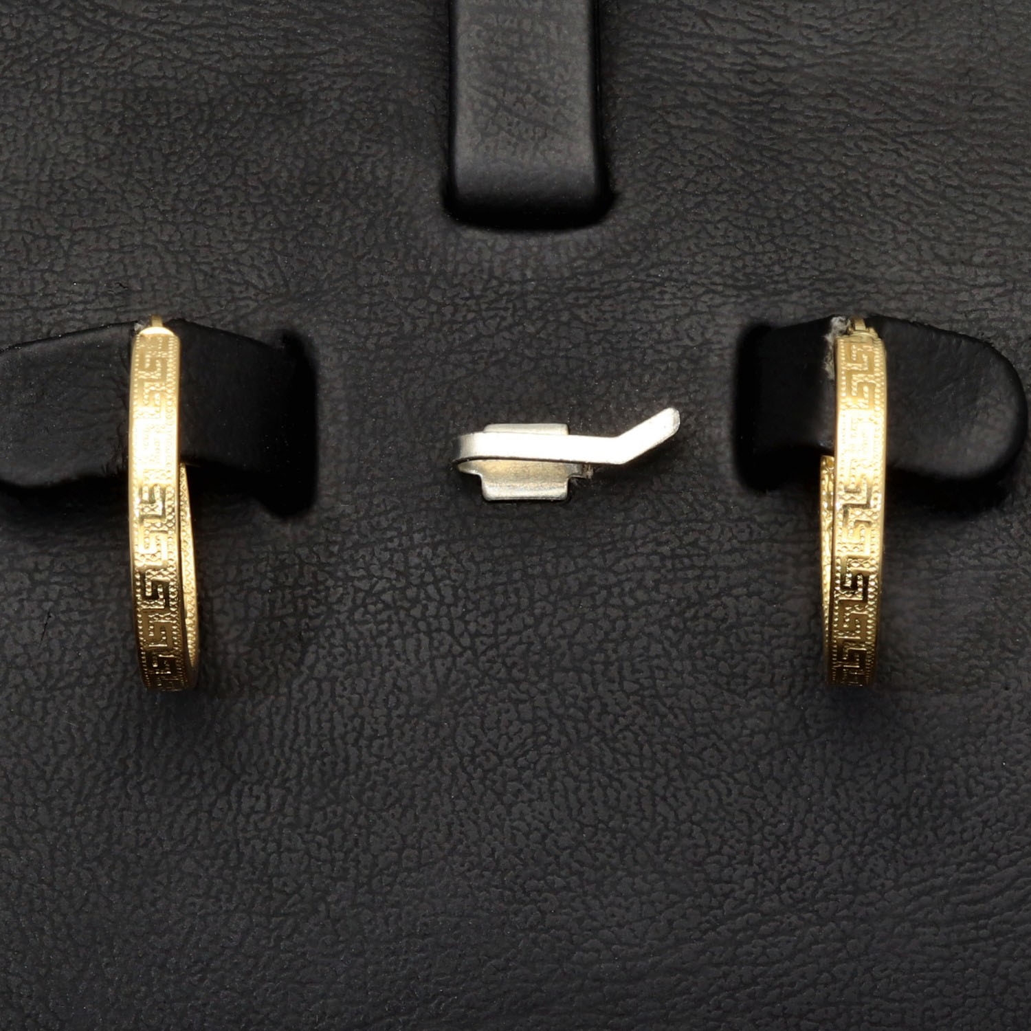 Diese edlen Creolen aus echtem 585 / 14K Gold überzeugen durch ihr zeitloses und zugleich modernes Design. Die kunstvoll eingearbeitete Greco-Musterung verleiht den Ohrringen eine elegante, mediterrane Note und macht sie zu einem echten Blickfang – sowohl im Alltag als auch zu besonderen Anlässen.