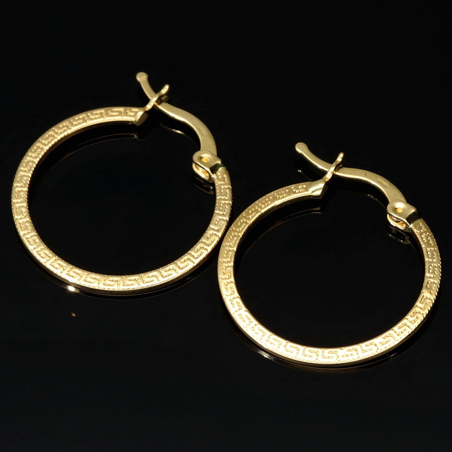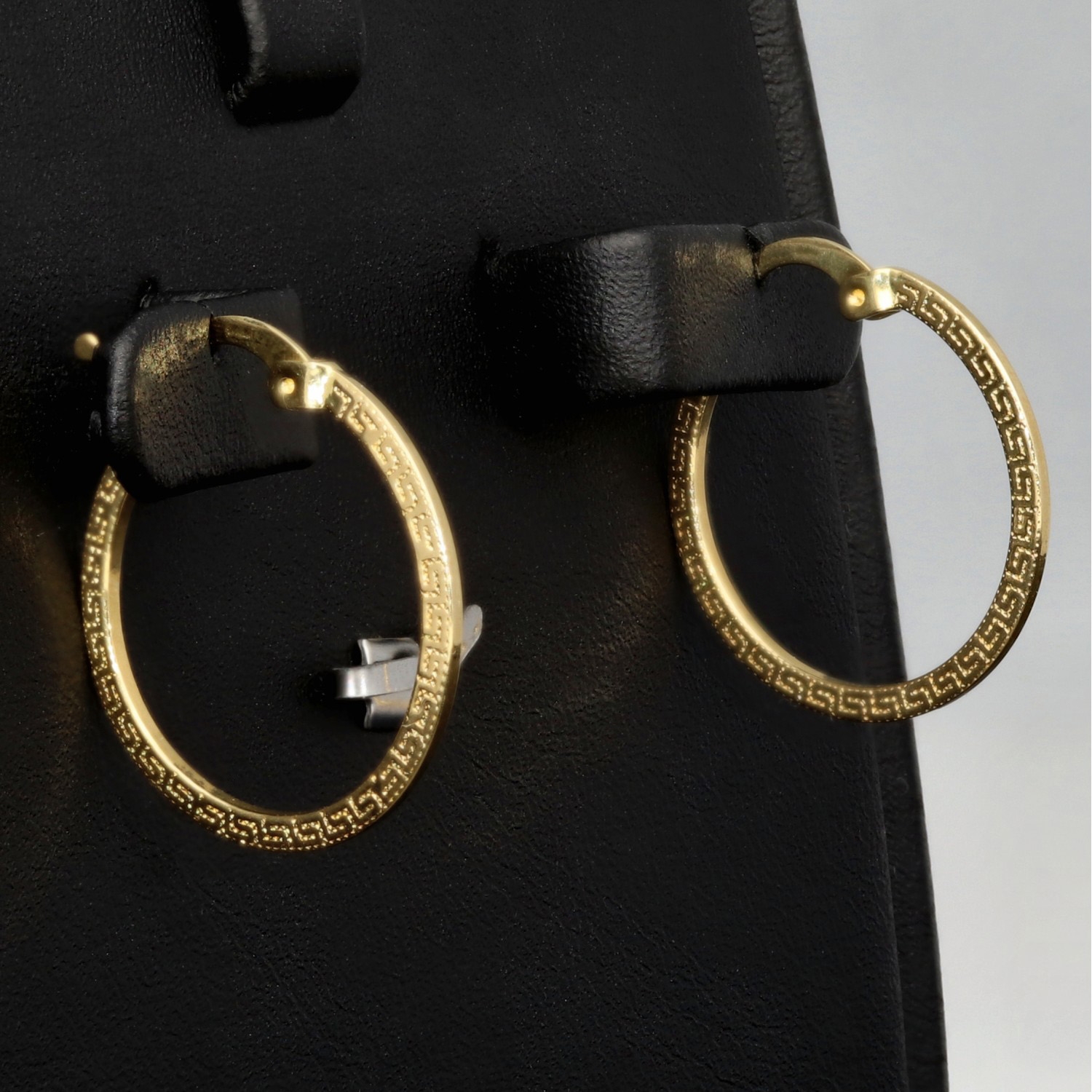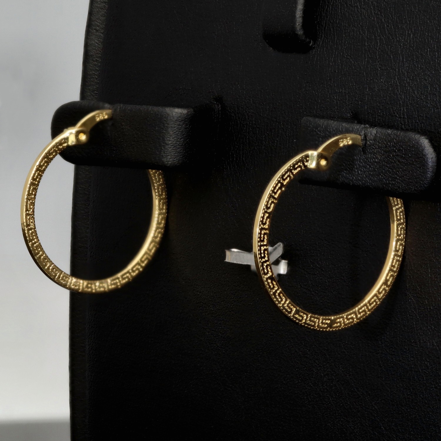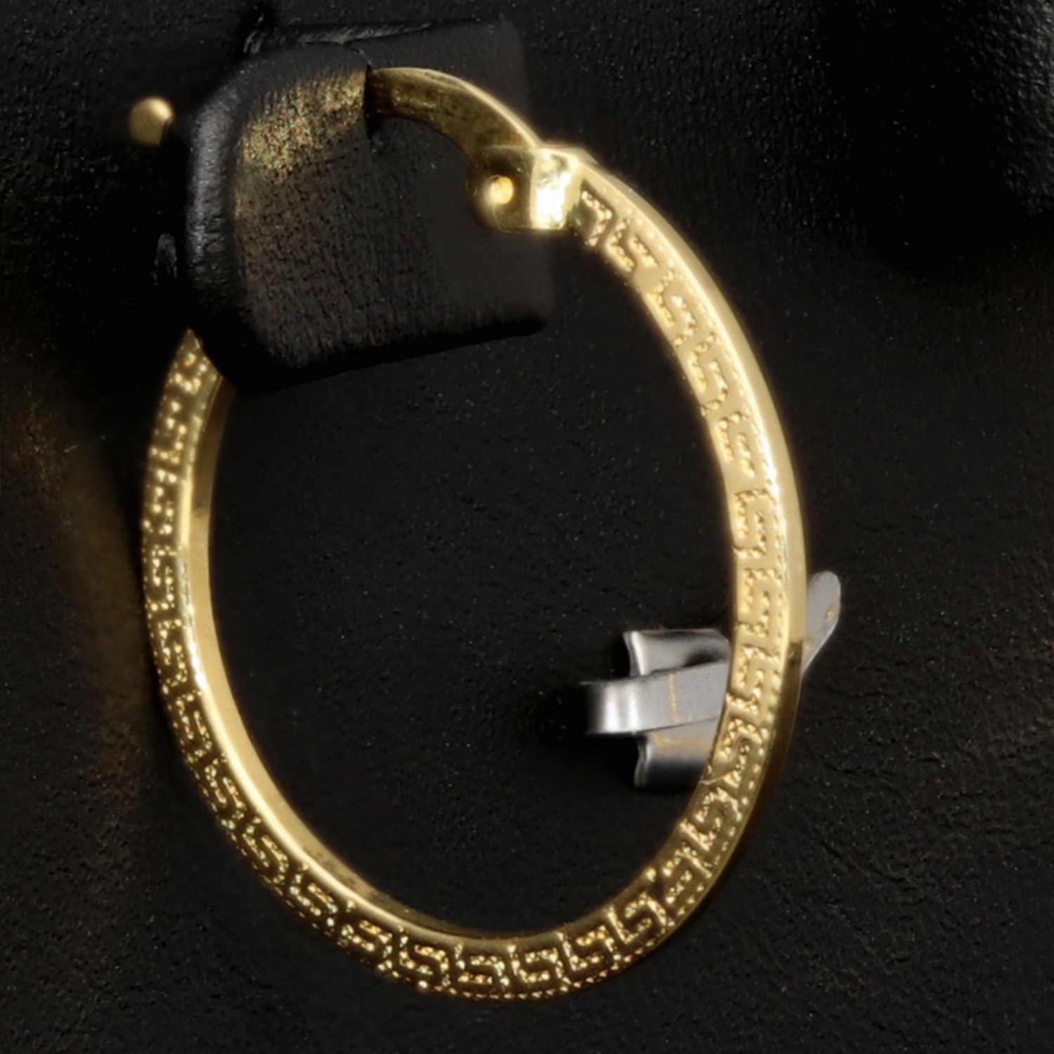 Diese wunderschönen Creolen aus hochwertigem 585 / 14K Gelbgold vereinen stilvolle Schlichtheit mit einem Hauch antiker Raffinesse. Das feine Greco-Muster verleiht den Ohrringen ihre besondere Struktur und einen dezenten Glanz, der jede Bewegung sanft widerspiegelt.