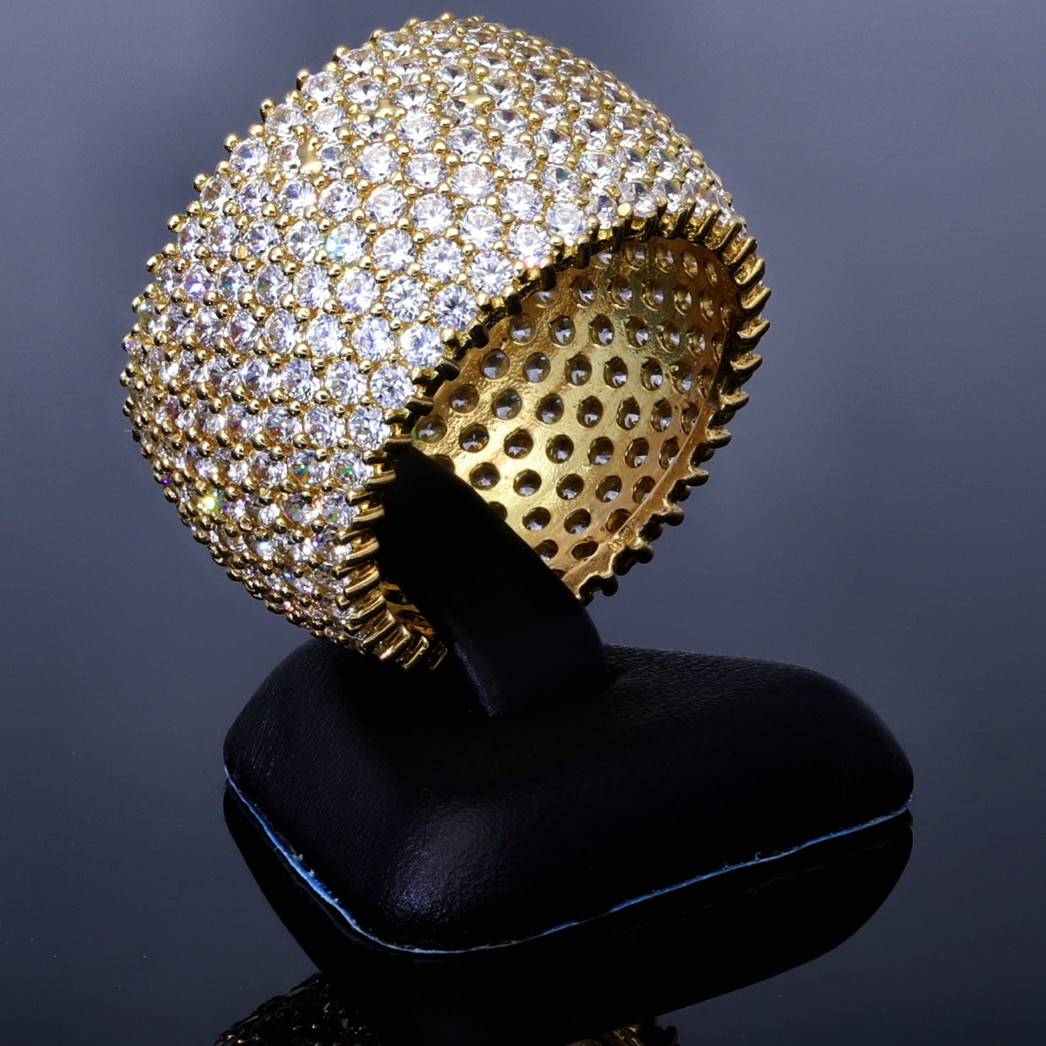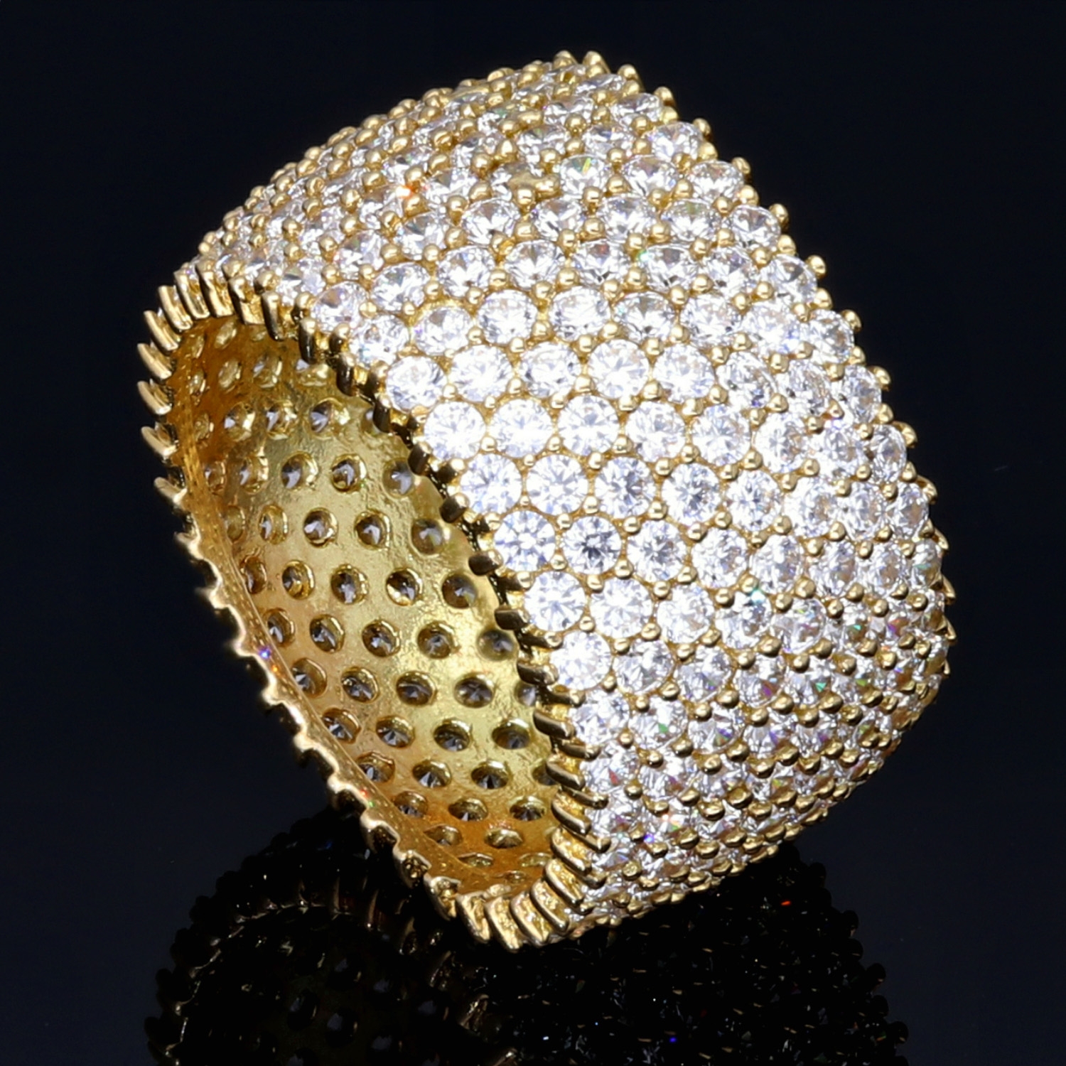 Die präzise gesetzten Steine sorgen für ein intensives Glitzern bei jeder Bewegung und verleihen dem Ring eine besonders glamouröse Ausstrahlung. Die leicht gewölbte Form unterstreicht den modernen Charakter und bietet gleichzeitig einen angenehmen Tragekomfort.