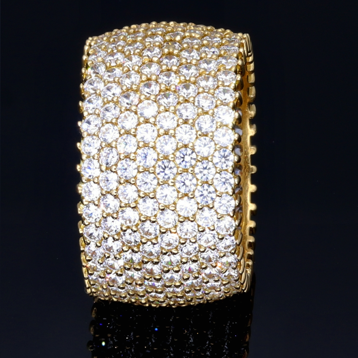 Dieser eindrucksvolle Statement-Ring vereint luxuriöses Design mit hochwertiger Verarbeitung und zieht alle Blicke auf sich. Gefertigt aus edlem 585er (14 Karat) Gelbgold, begeistert das breite Ringband durch seinen vollflächigen, funkelnden Steinbesatz im eleganten Pavé-Stil.