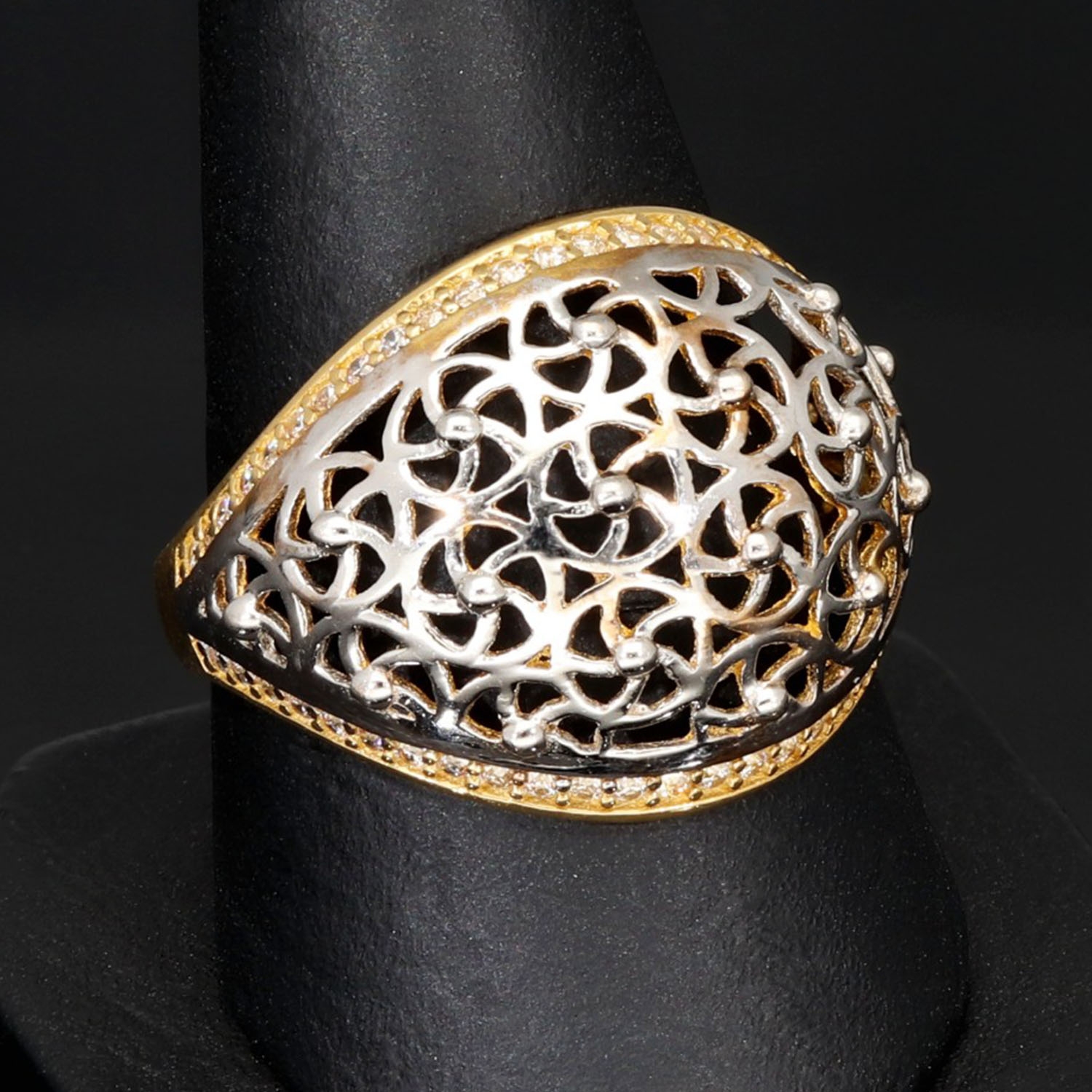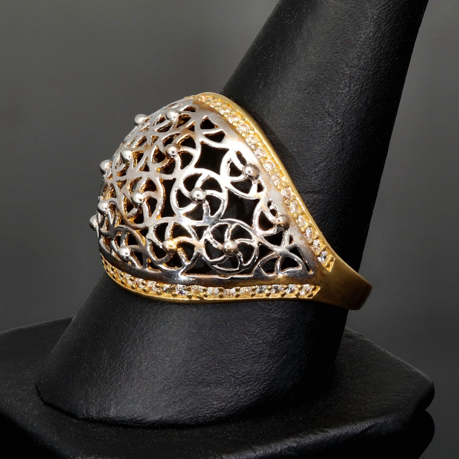 Eleganter Damenring in aufwendig gearbeiteter Filigran-Optik aus hochwertigem 585er (14 Karat) Bicolor-Gold, bestehend aus Gelbgold und Weißgold. Das kunstvoll durchbrochene Ornament-Design verleiht dem Ring eine besonders edle und luftige Ausstrahlung und macht ihn zu einem echten Blickfang.