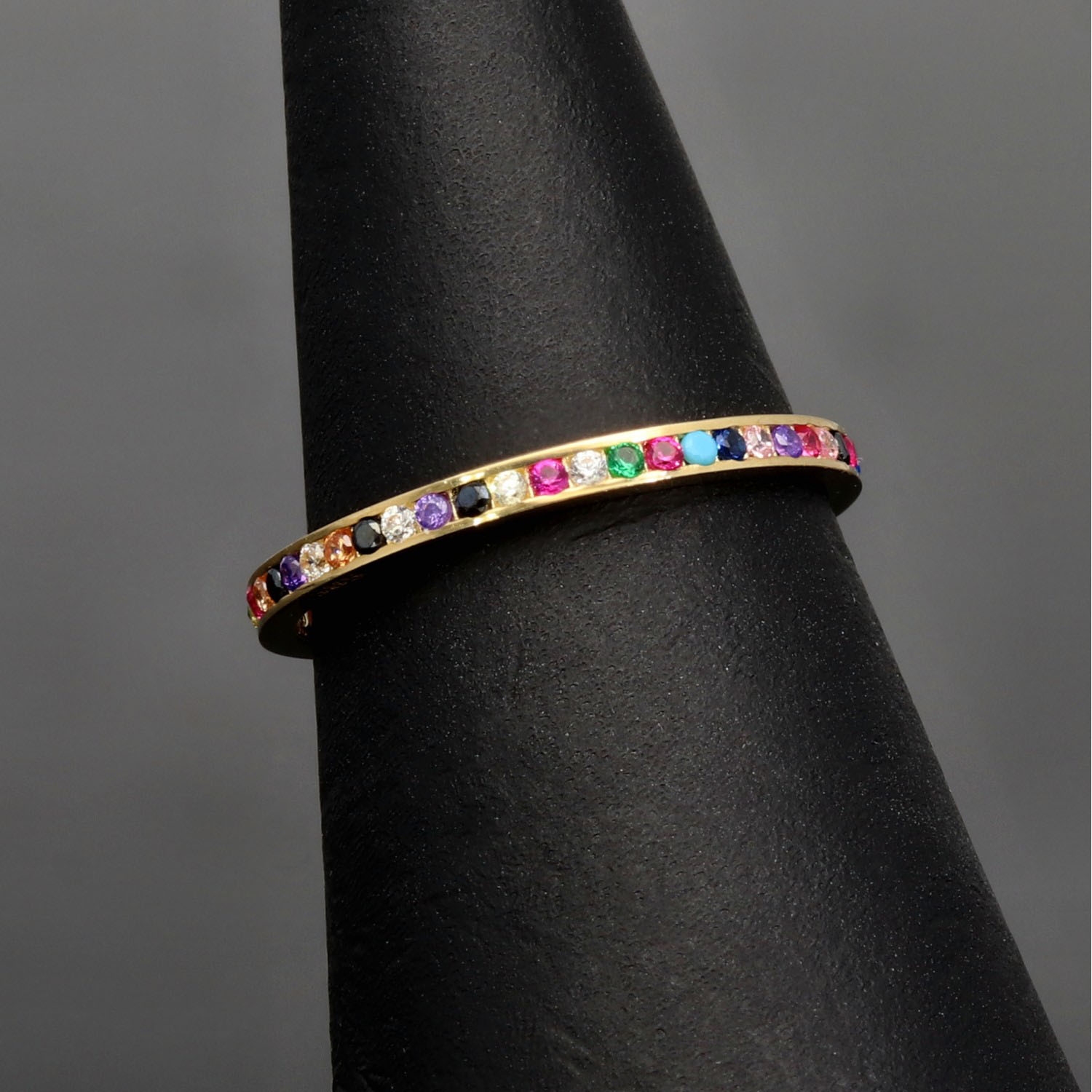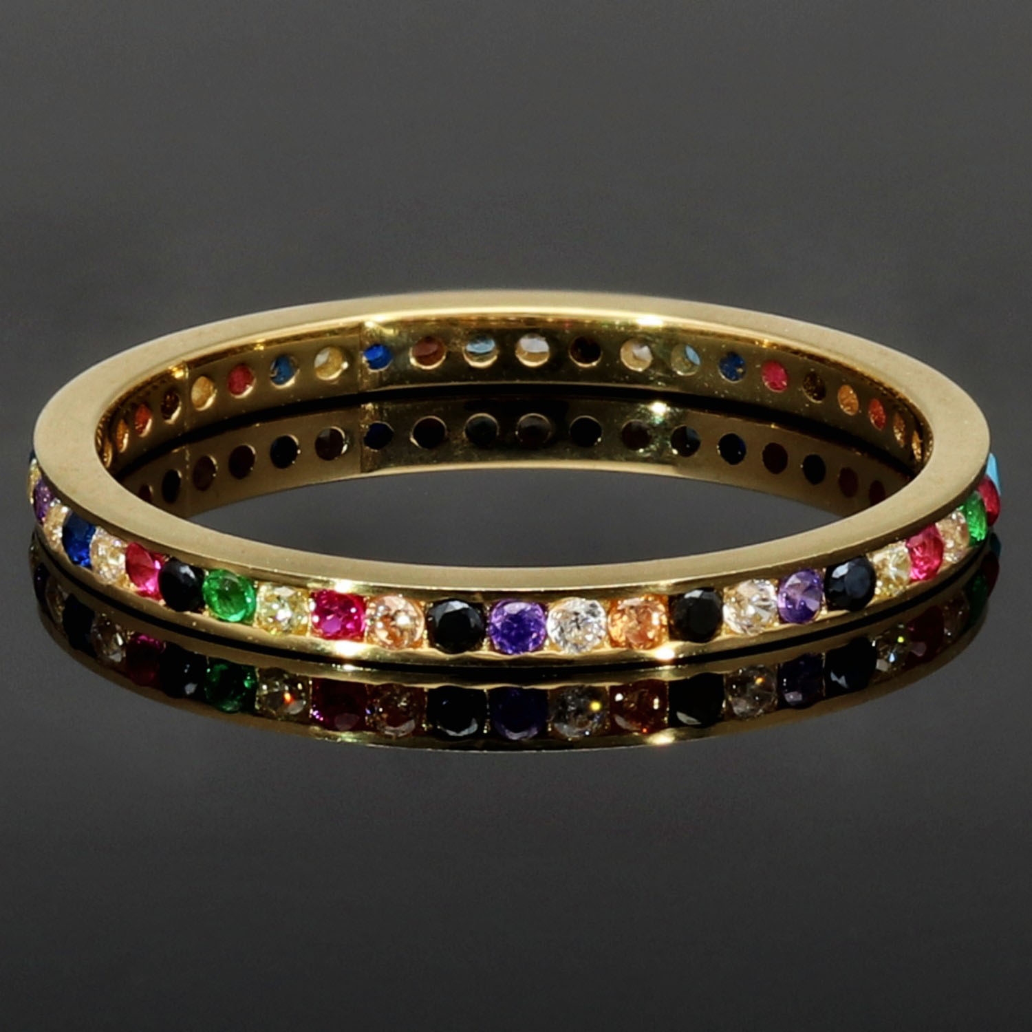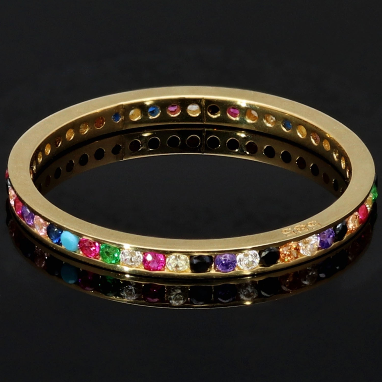 Rainbow Memory Ring aus edlem 14K (585) Gold, rundum besetzt mit funkelnden, farbenfrohen Zirkonia-Steinen. Ein außergewöhnliches Schmuckstück mit leuchtendem Farbspiel in Ringgröße ca. 50.