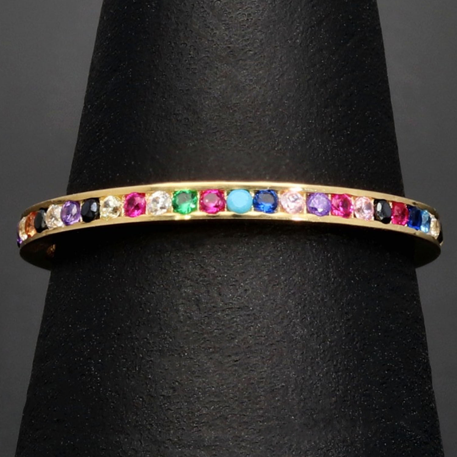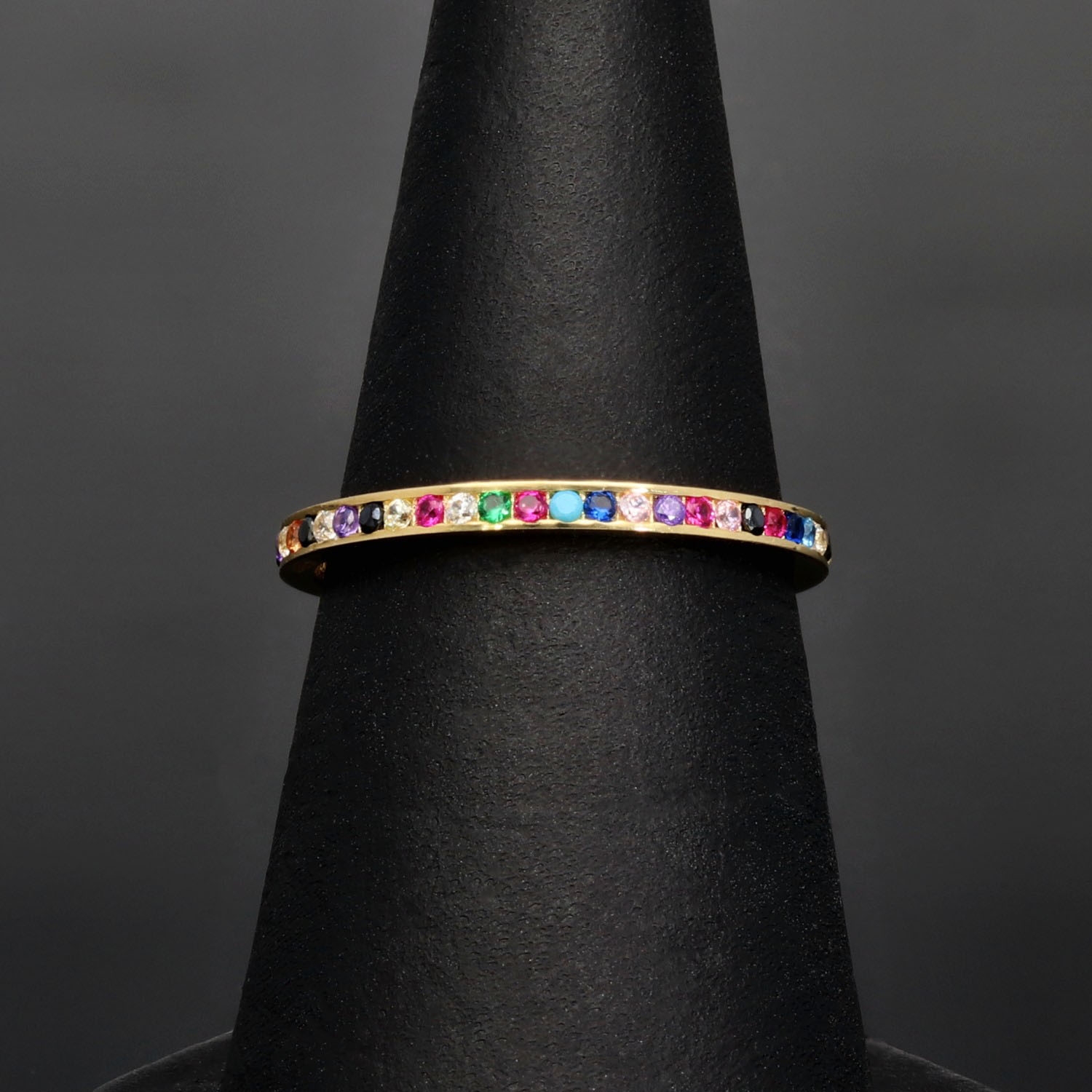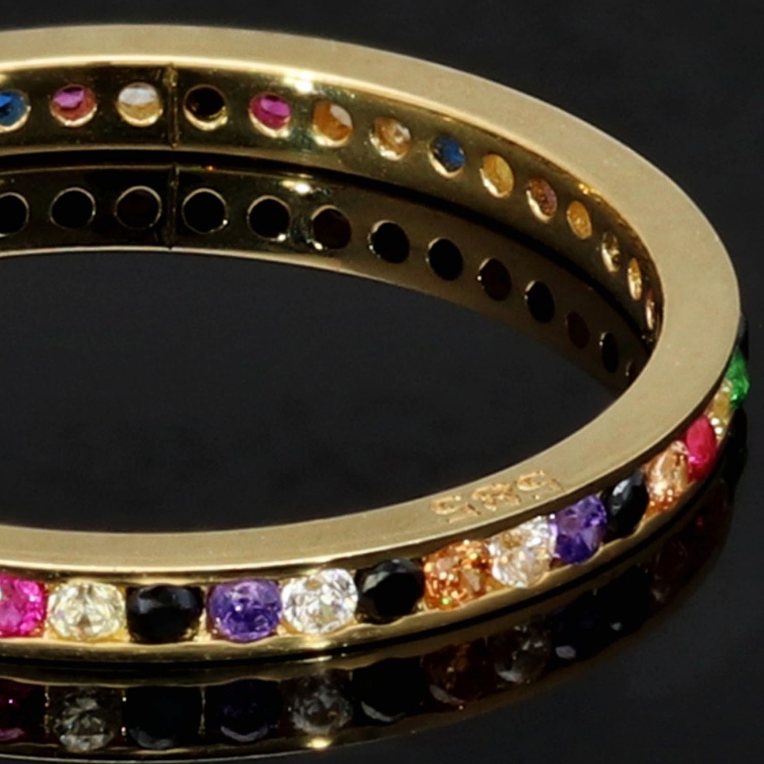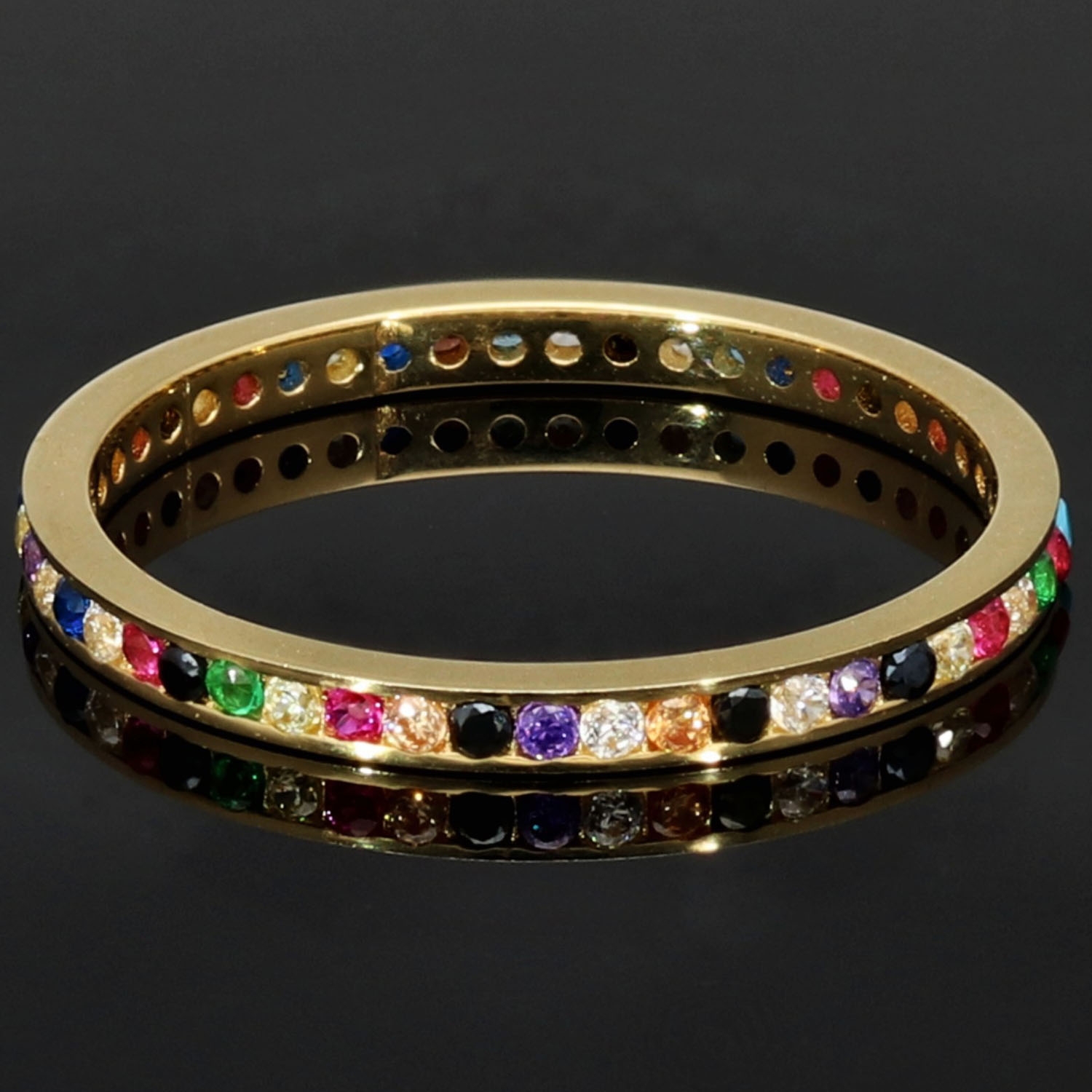 Rainbow Memory Ring aus edlem 14K (585) Gold, rundum besetzt mit funkelnden, farbenfrohen Zirkonia-Steinen. Ein außergewöhnliches Schmuckstück mit leuchtendem Farbspiel in Ringgröße ca. 50.