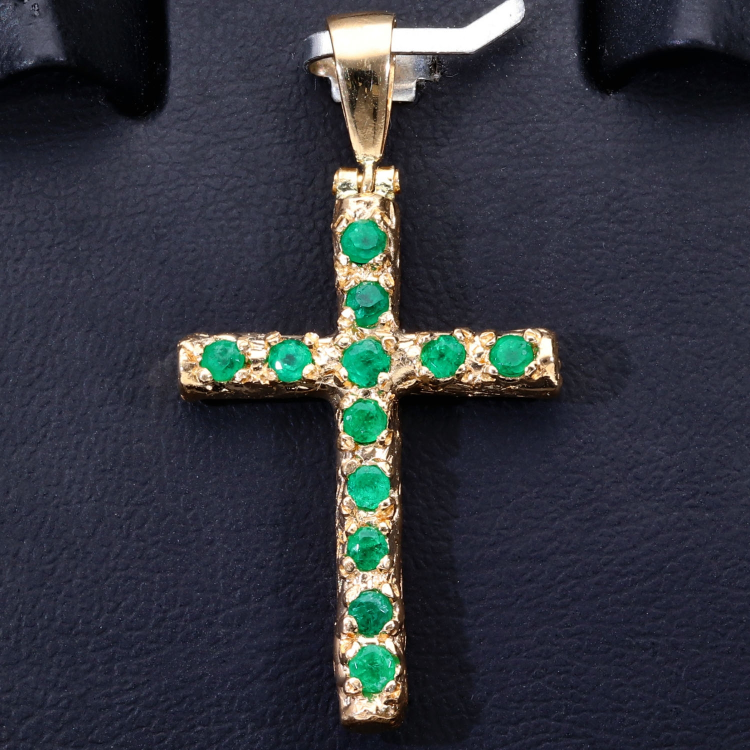 Kreuzanhänger mit 12 leuchtenden, intensiv grünen Smaragden in einer besonderen Art der Krappenfassung fixiert. Modern und zugleich zeitlos. (750er 18K Gold)